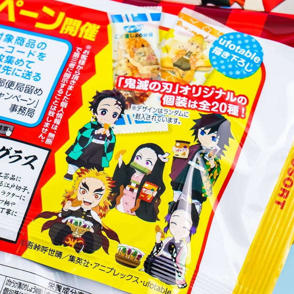Rice cracker bags feature prints of Demon Slayer characters randomly selected from a set of 20 designs