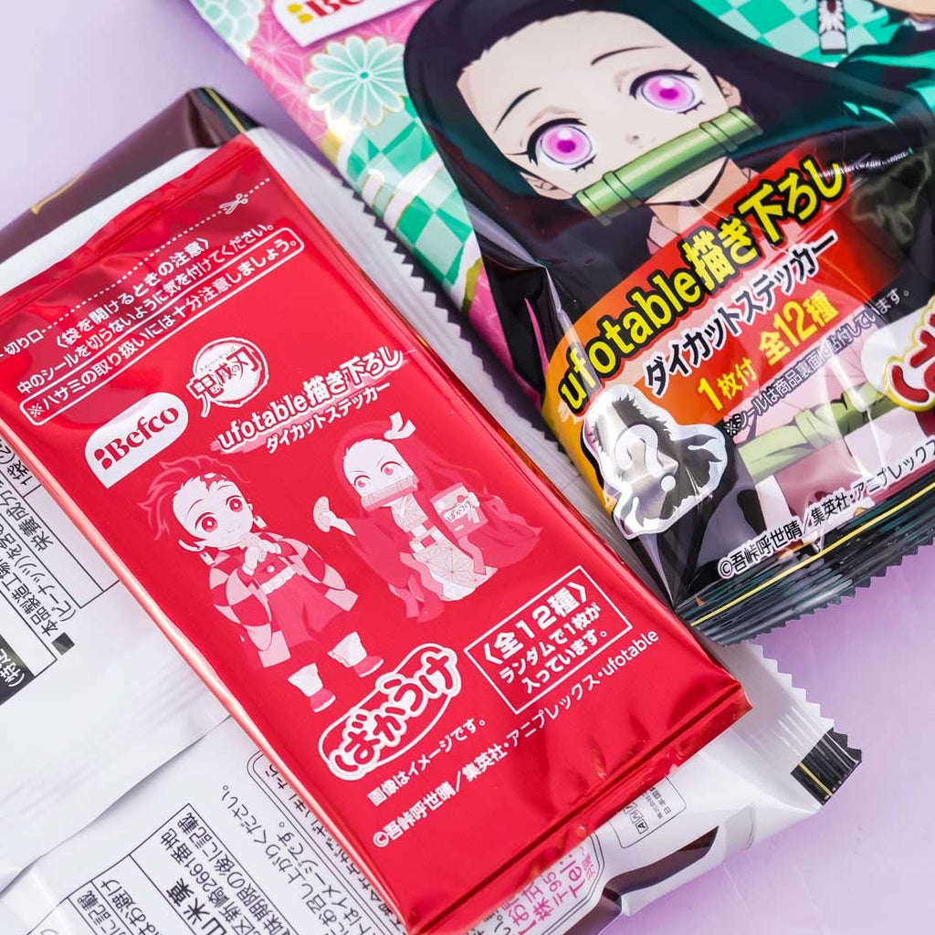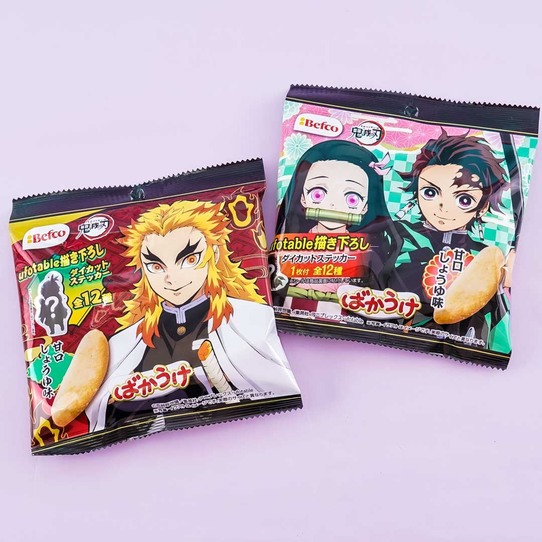 Munch on this pack of soy sauce-flavored bakauke or banana-shaped rice crackers illustrated with Demon Slayer characters. You'll receive a random package design when you order. These crackers come with a sticker randomly selected from a set of 12.