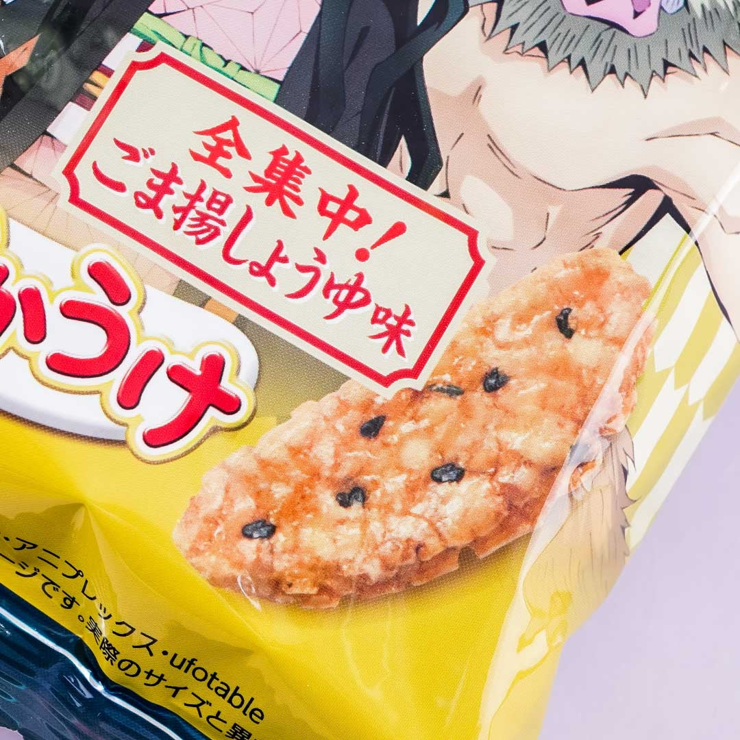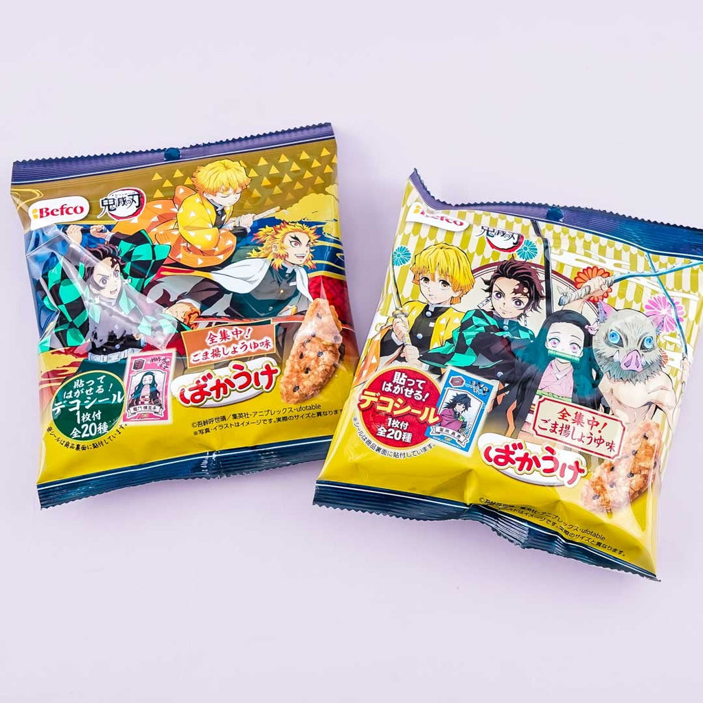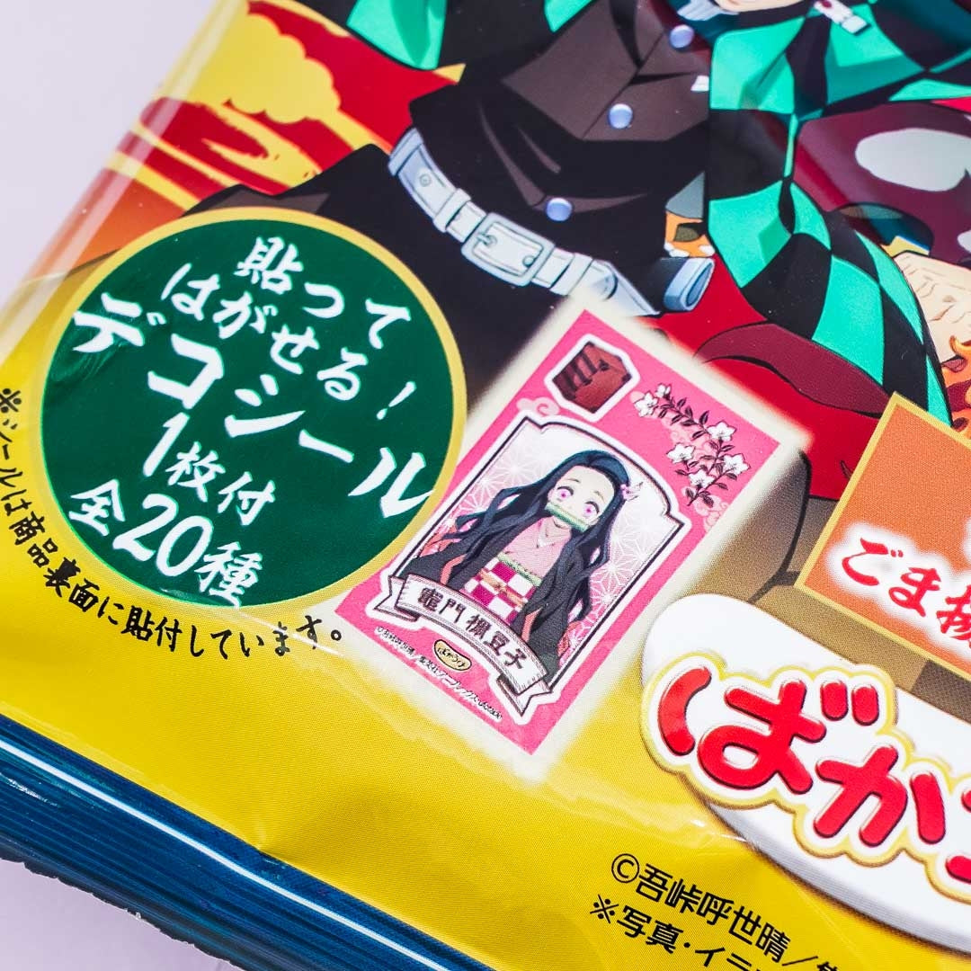Have fun snacking on these bakauke or banana-shaped senbei snacks! Each rice cracker has a savory soy sauce taste and is packed with more sesame seeds than the regular variants. You’ll receive a random Demon Slayer: Kimetsu No Yaiba printed snack pack and a matching free sticker with a random illustration out of twenty possible characters from this popular action animé and manga series!