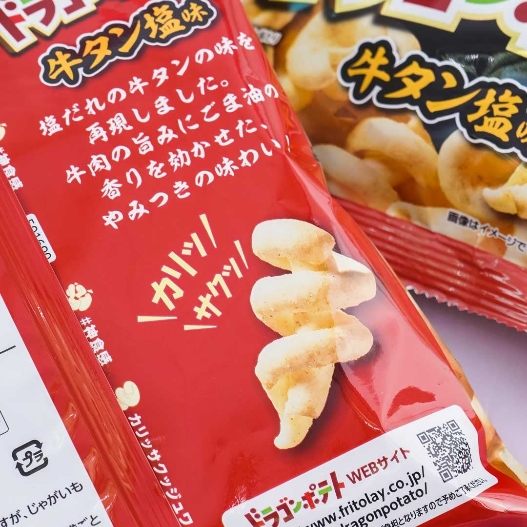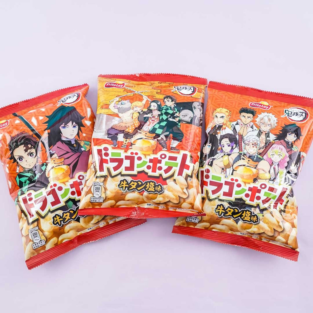 A pack of dragon-shaped potato chips with a salty beef tongue flavor featuring Demon Slayer characters