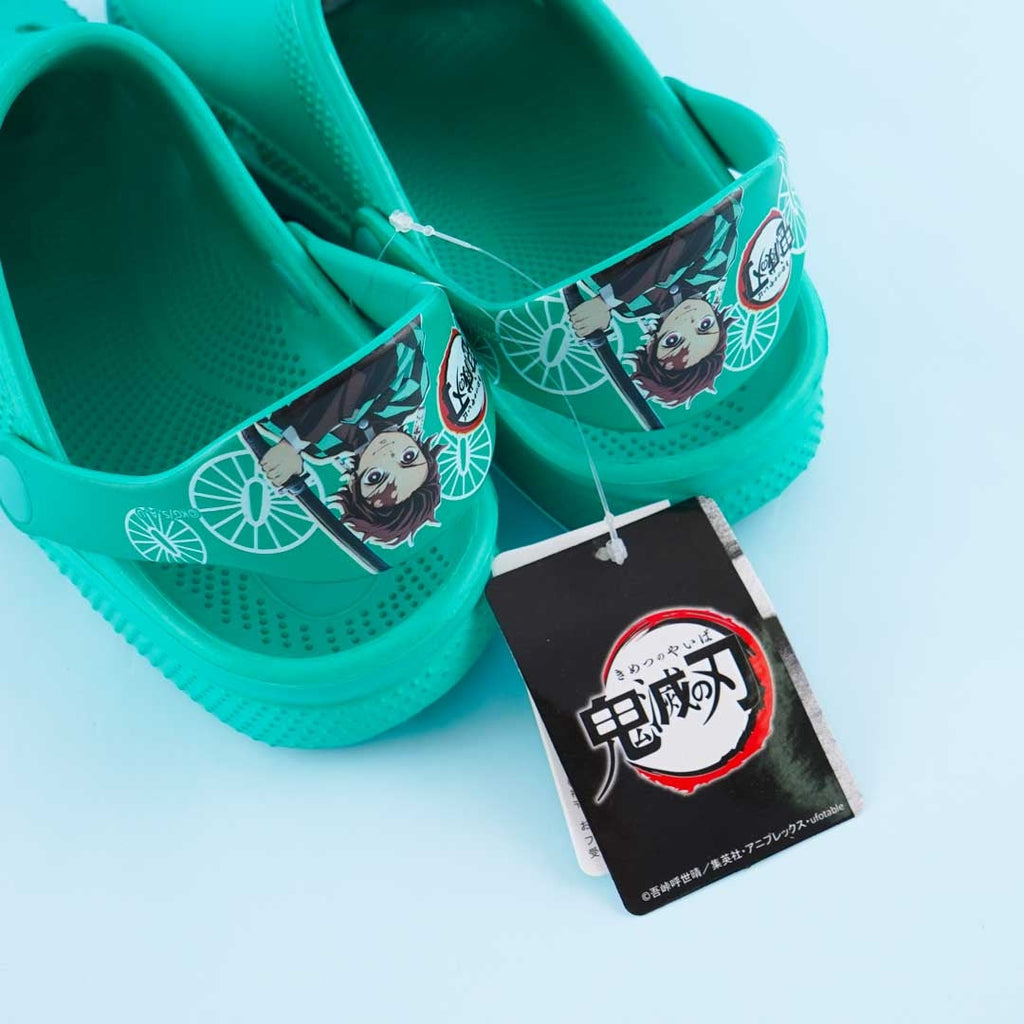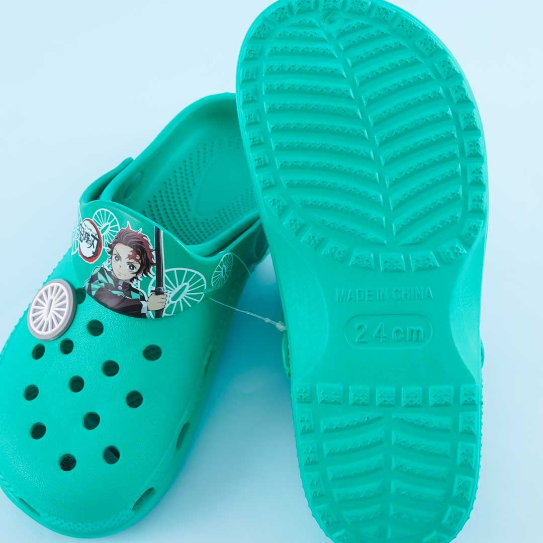 • A cute pair of green sandals with illustrations of Demon Slayer’s Tanjiro Kamado