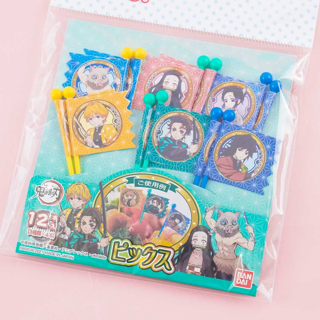 A set of kawaii food picks with flags featuring Demon Slayer: Kimetsu No Yaiba characters