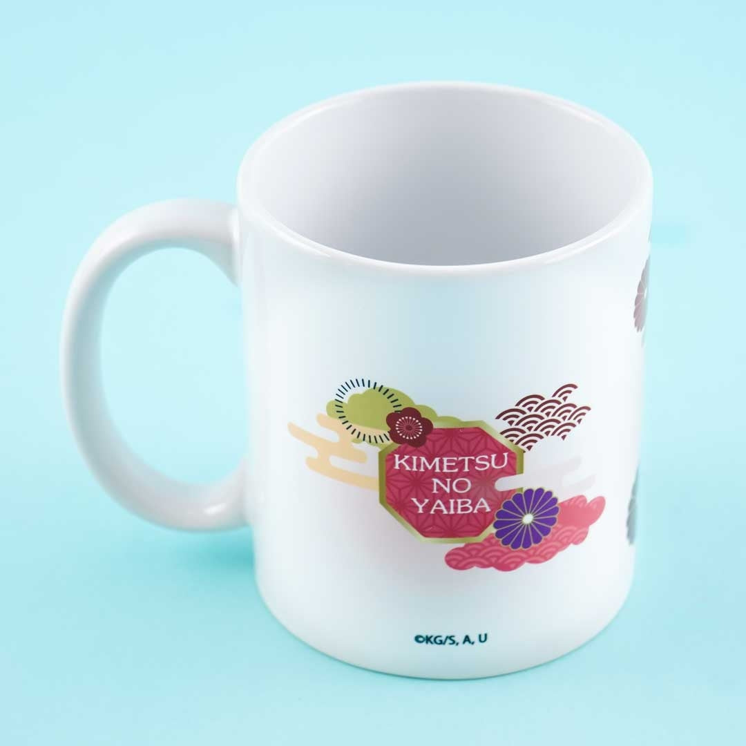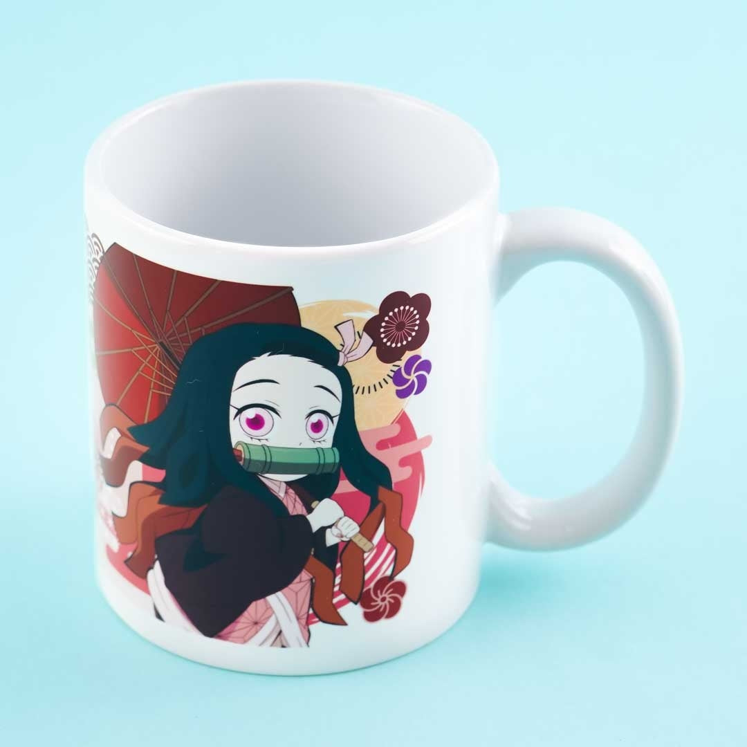 • A cute mug with illustrations of Demon Slayer’s Nezuko Kamado surrounded by traditional Japanese flowers