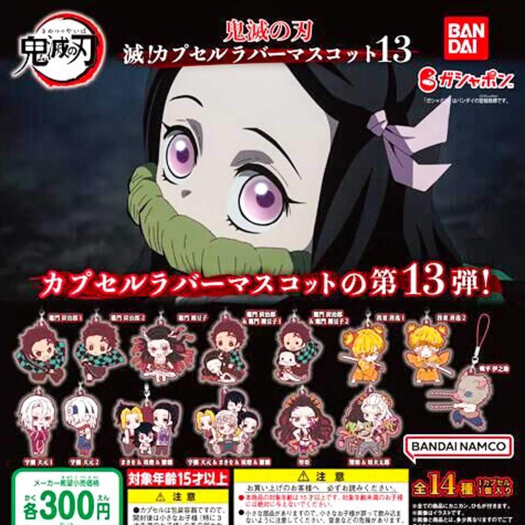 A colorful gachapon with a Demon Slayer rubber charm from the "Demon Slayer Metsu! Rubber Charm" series