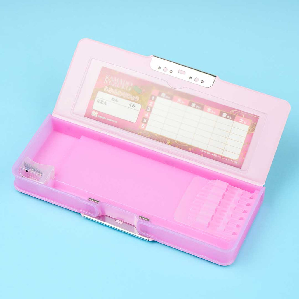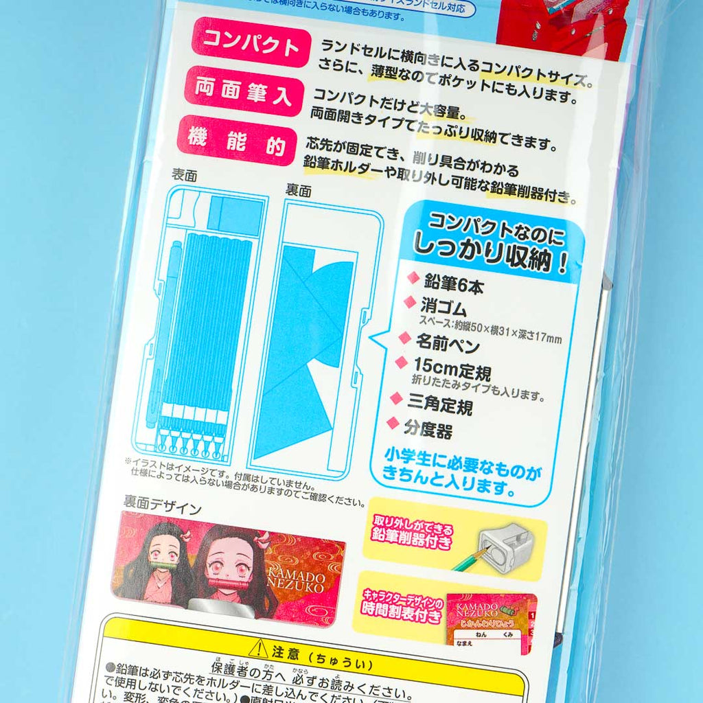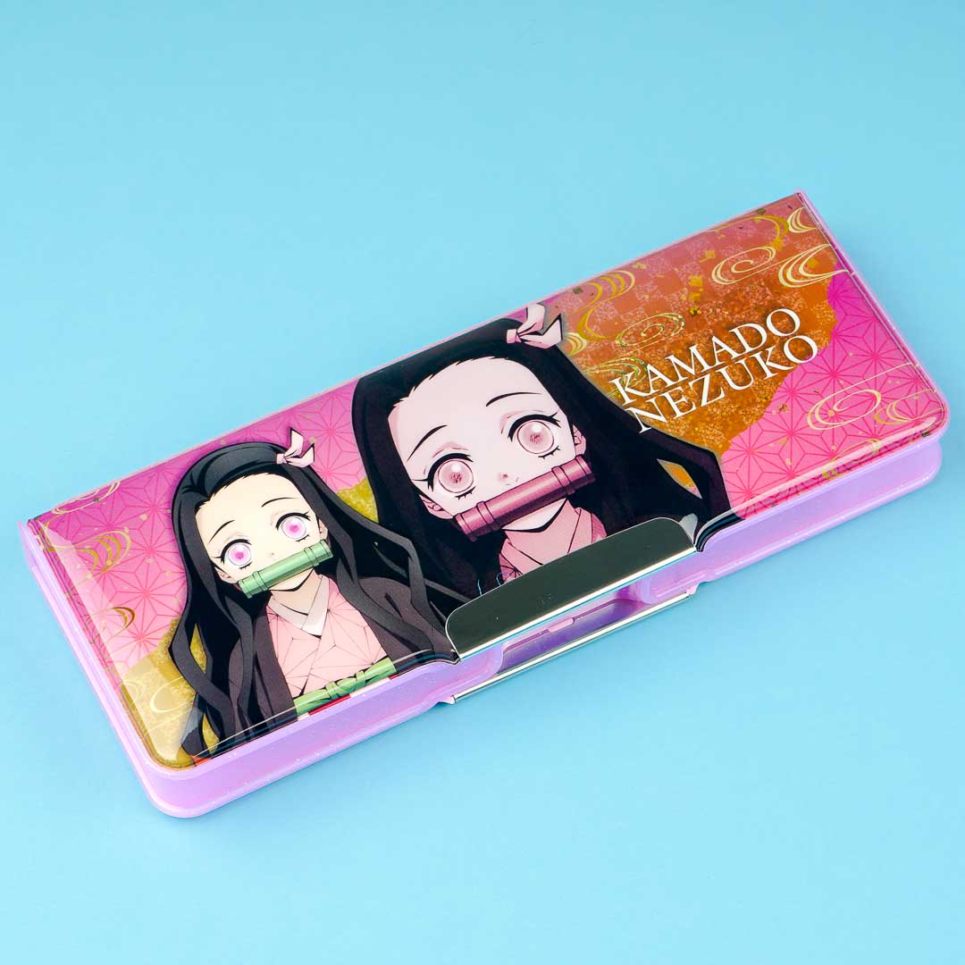 This kawaii double-sided pencil case is decorated with cute illustrations of Nezuko Kamado from the anime Demon Slayer. It features two separate compartments with magnetic closures. Use this case to organize your pencils and pens!
