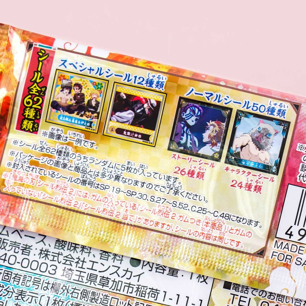 Enjoy collecting stickers of your favorite Demon Slayer: Kimetsu No Yaiba starting from this pack! It includes a random sticker out of sixty-two possible designs — fifty of which are normal type and twelve that have a shiny metallic finish! The set also comes with free soda-flavored gum.