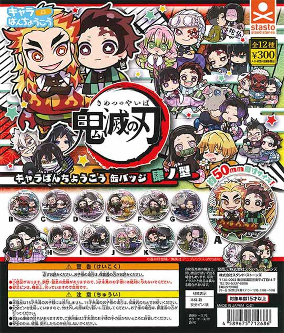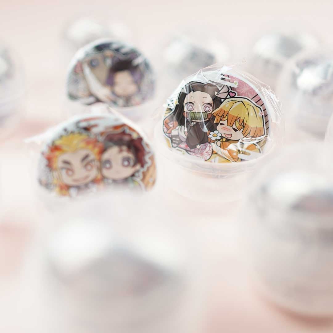 A kawaii gachapon capsule collectible from the Demon Slayer Chibi Tin Badge series
