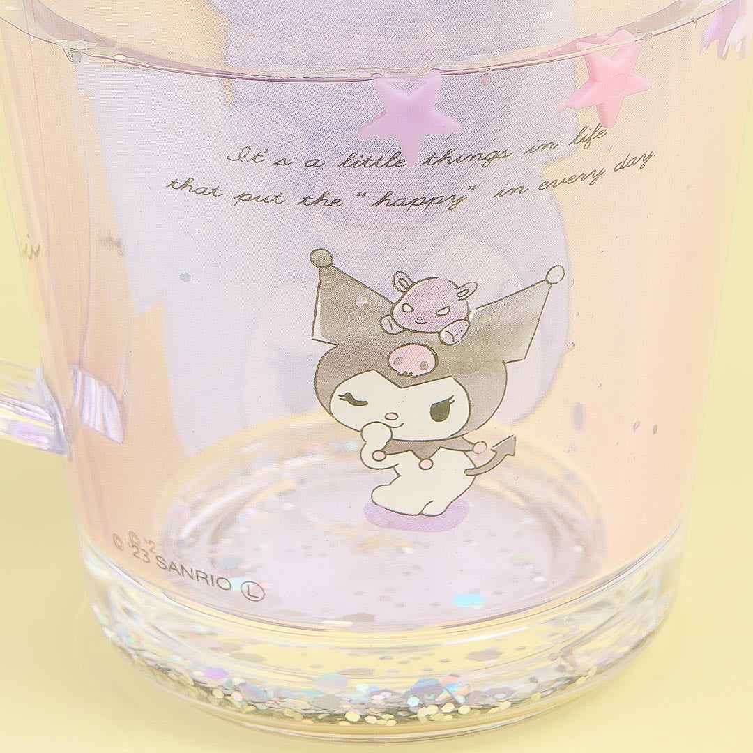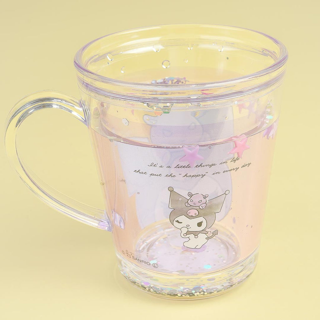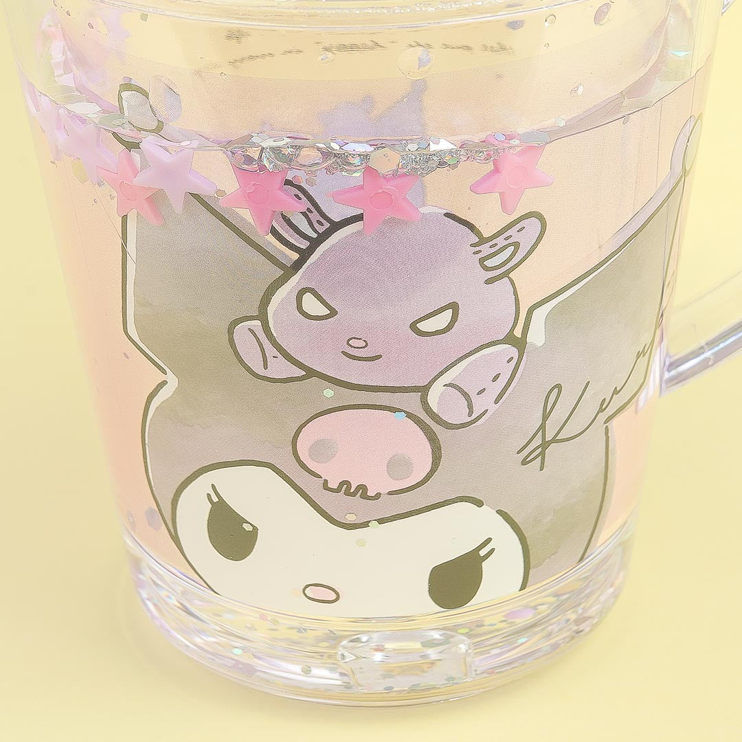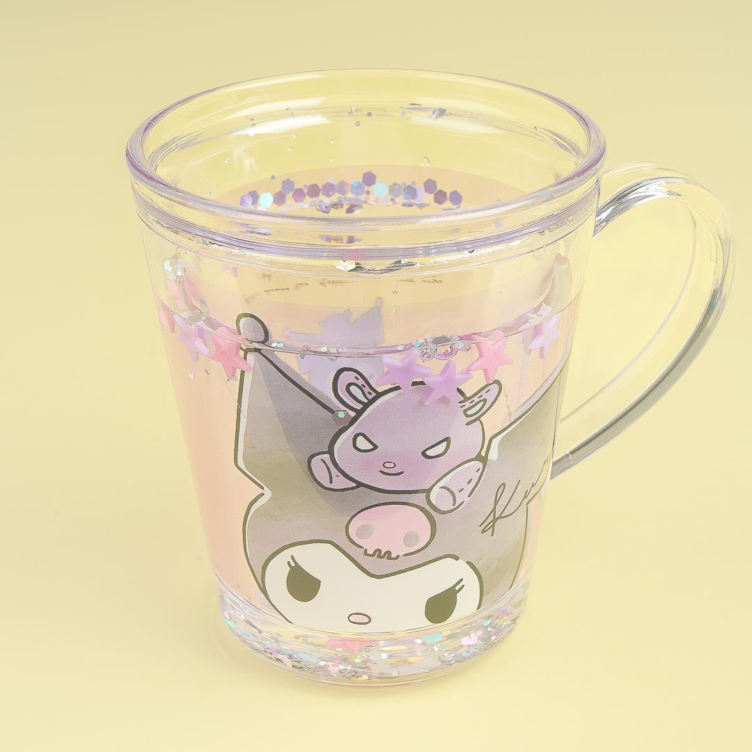 Pour your favorite drink into this cute plastic mug decorated with Kuromi playing with Baku. It has a fun layer of water between its walls with glitter, stars, and other kawaii decor. This mug is the perfect addition to your kawaii cupboard!