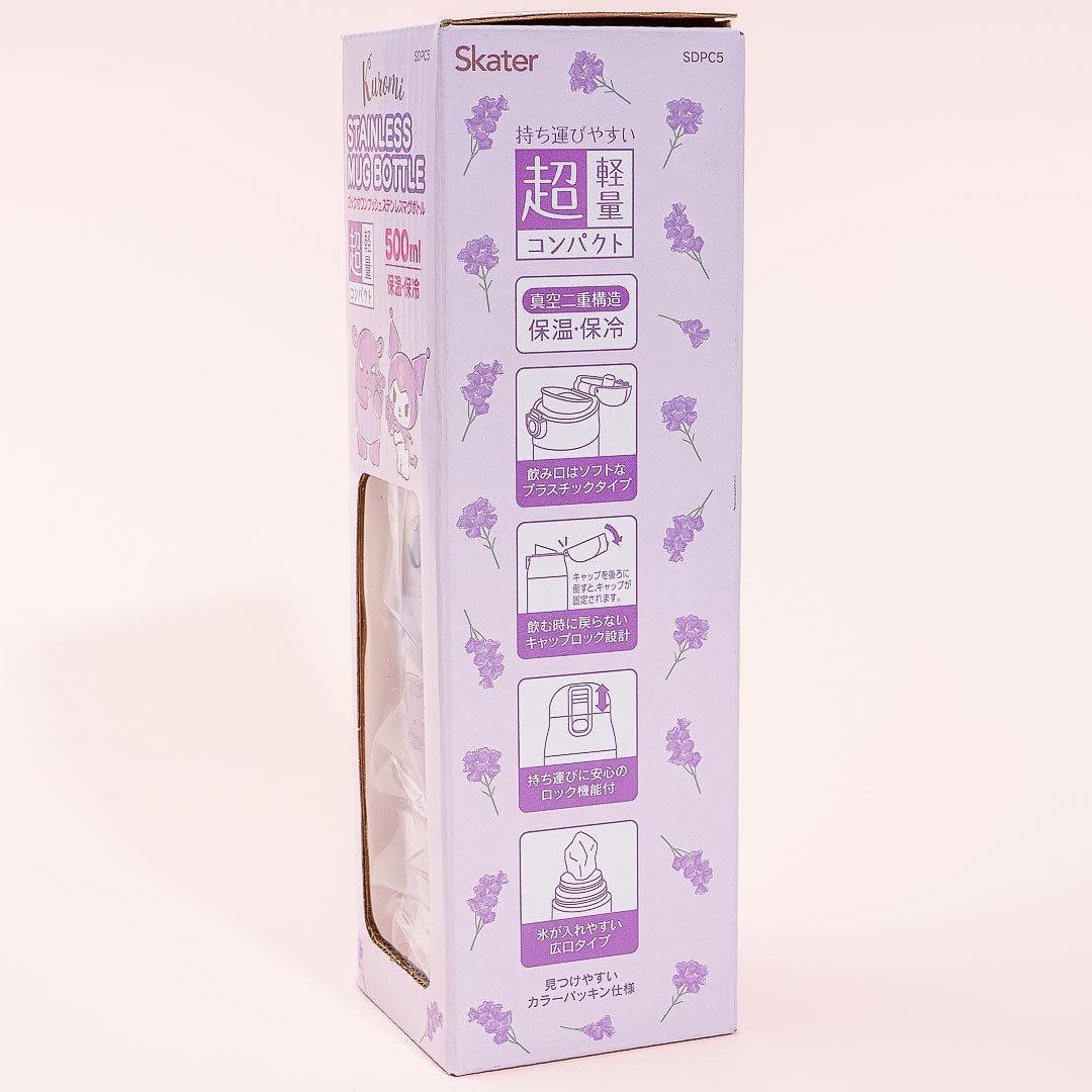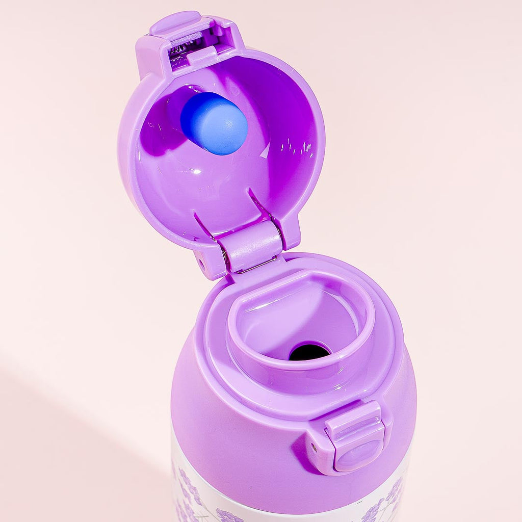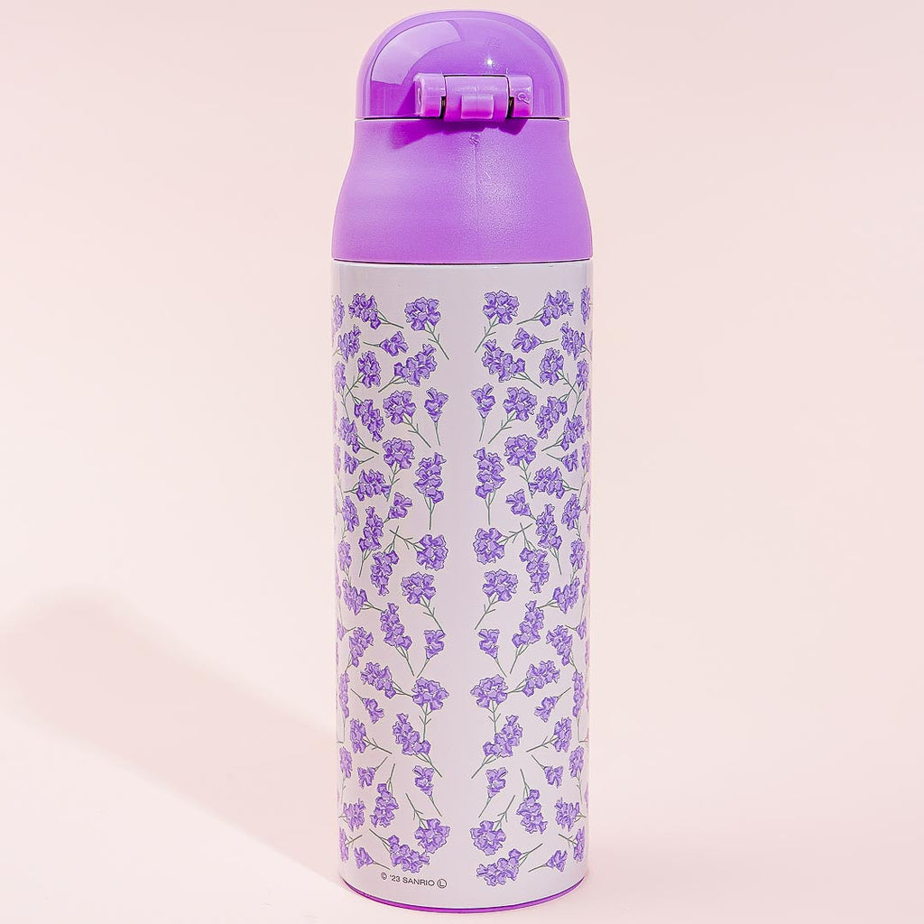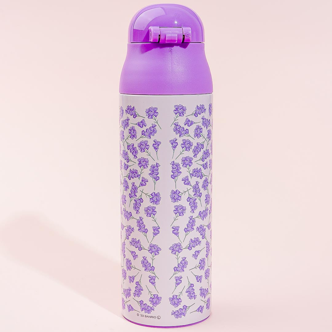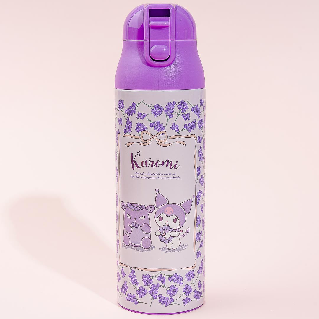Stay hydrated when you bring this lightweight thermal bottle outdoors! It features kawaii illustrations of Kuromi harvesting lavenders with her sidekick, Baku. This bottle has a one-push cap with a lock function so when you tilt it back, you can easily drink! It also has a double vacuum structure that keeps the drink warm or cold.