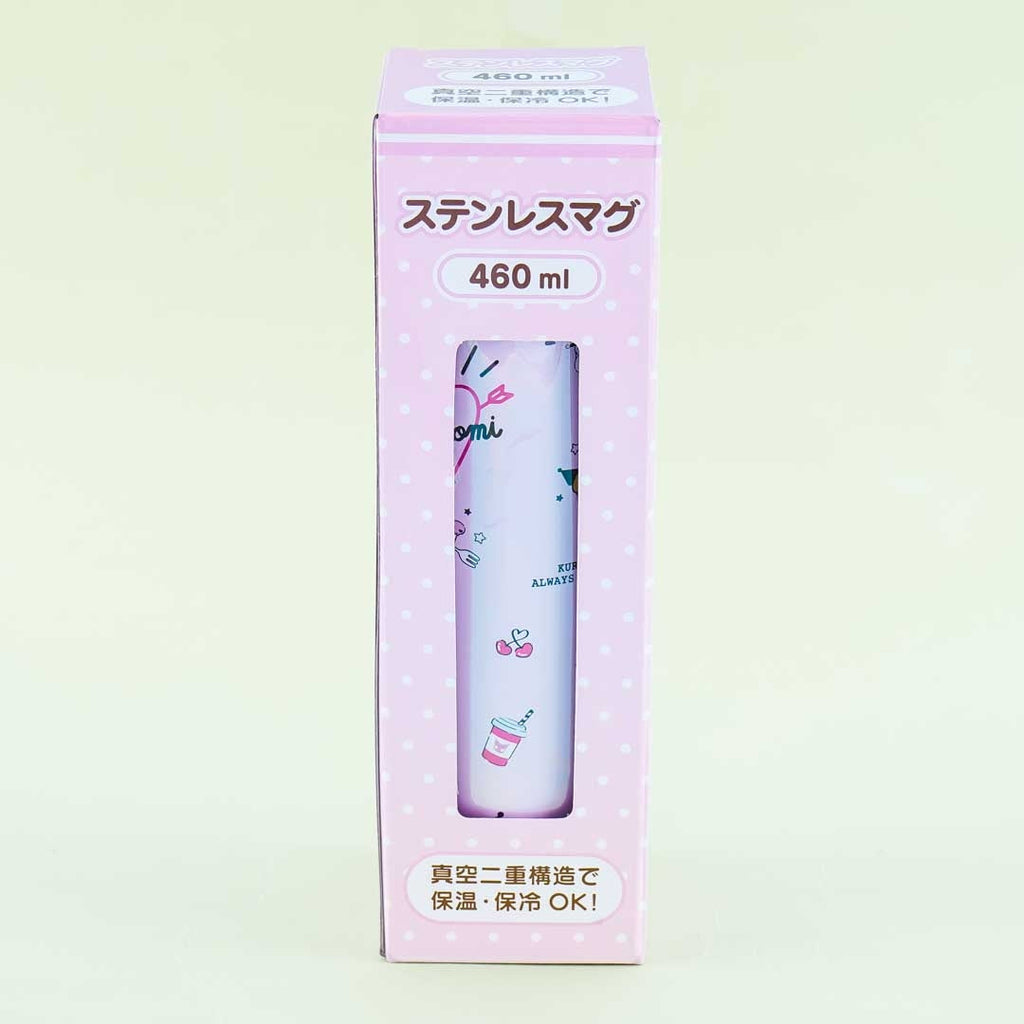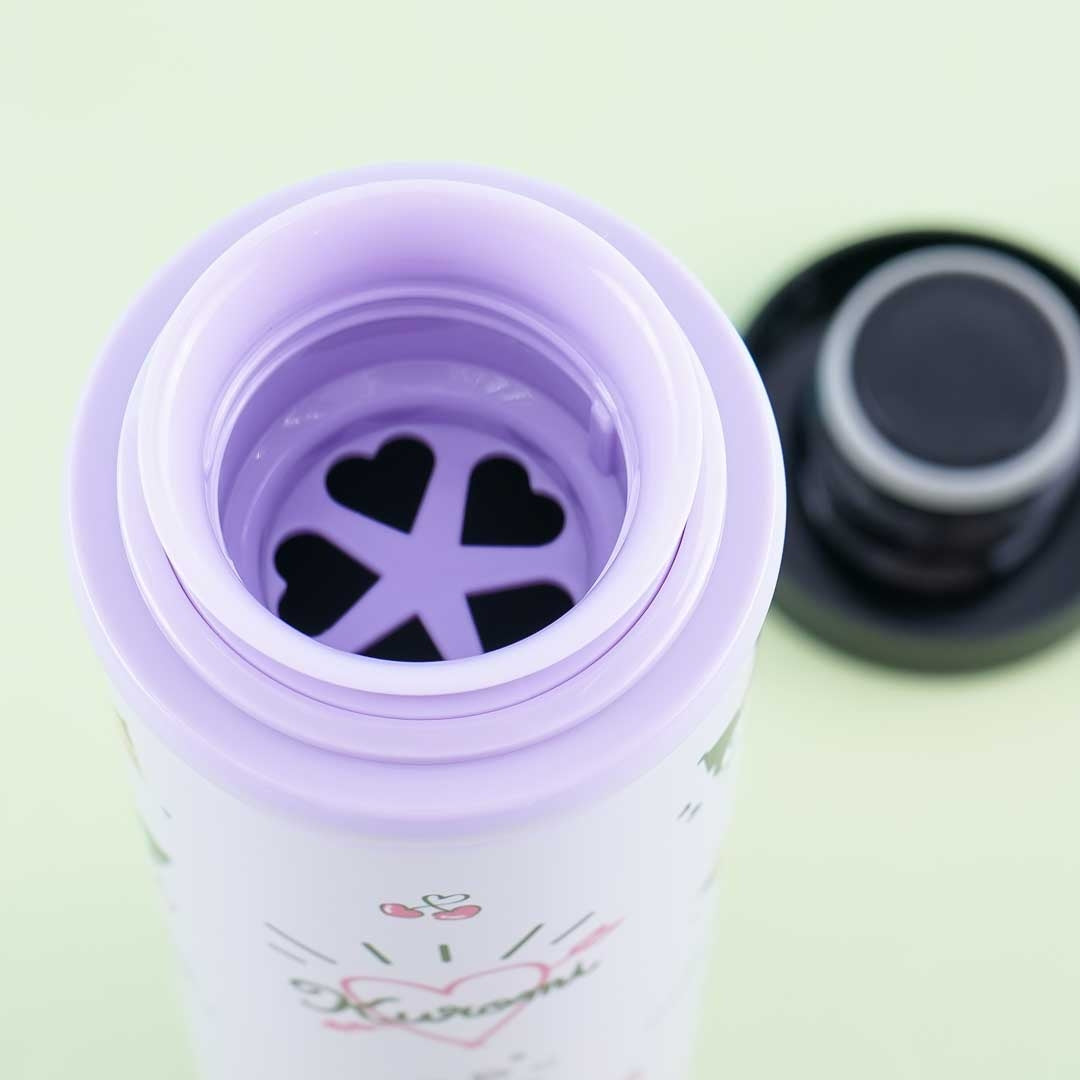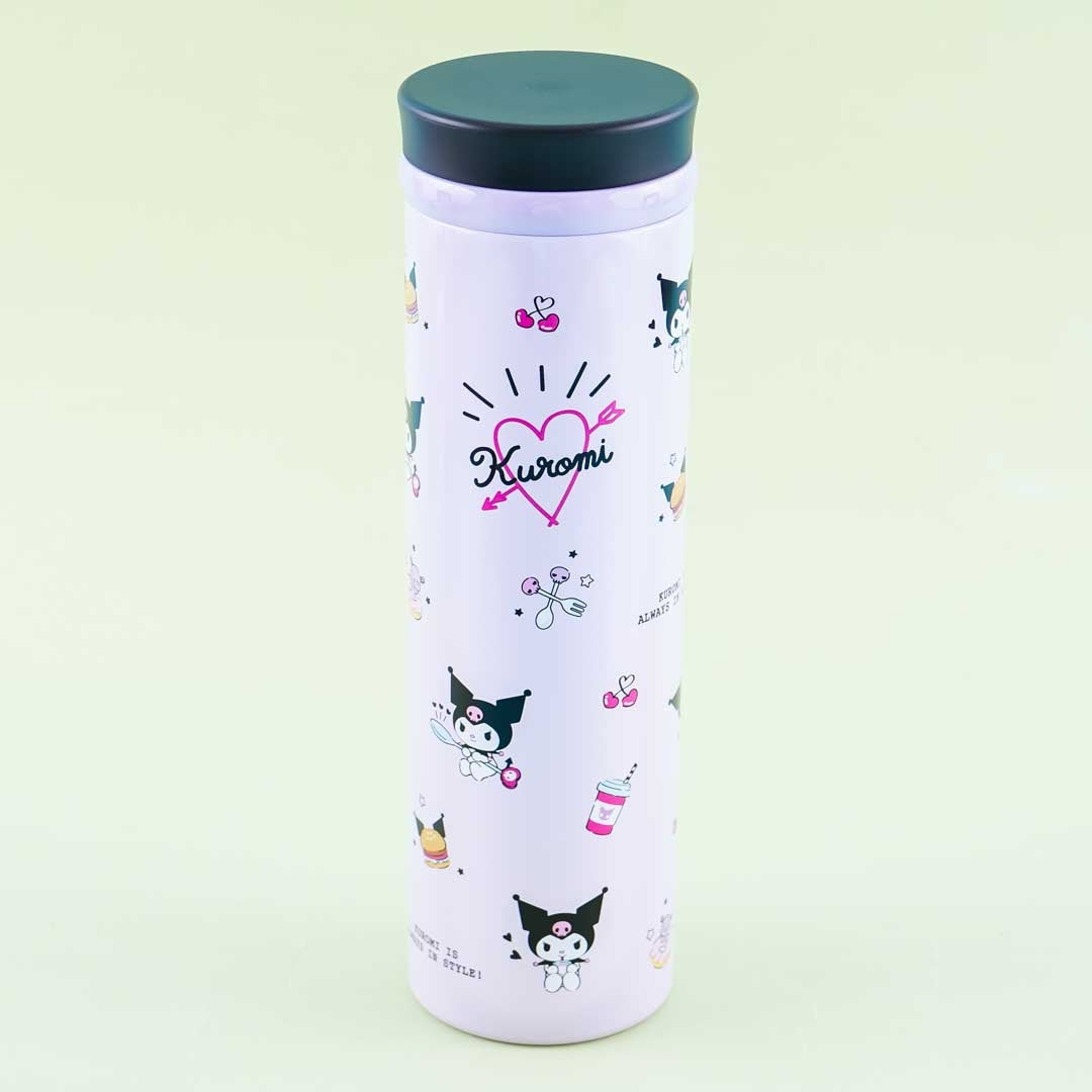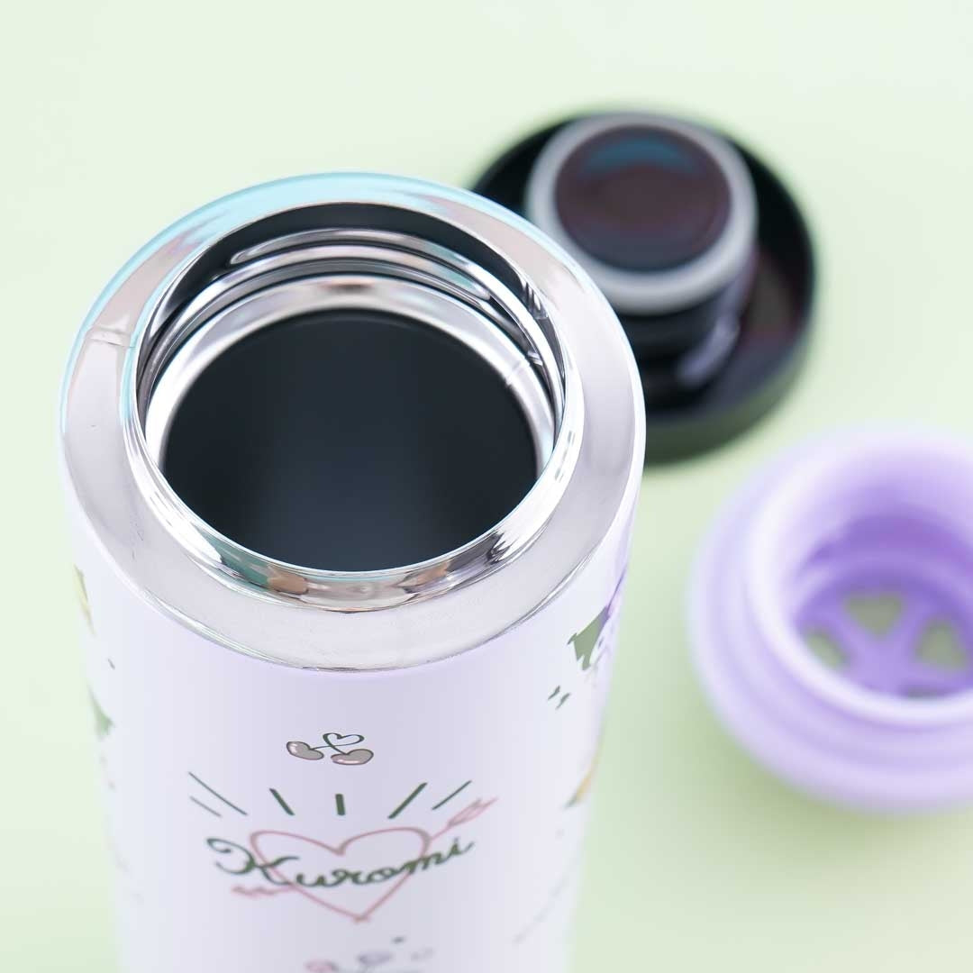 Use this super cute stainless steel bottle to stay rehydrated throughout the day! This lightweight bottle is covered in prints of Kuromi with drinks, burgers, and other things. It has a twist lid and a heart-shaped filter.