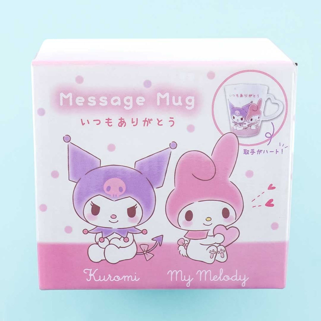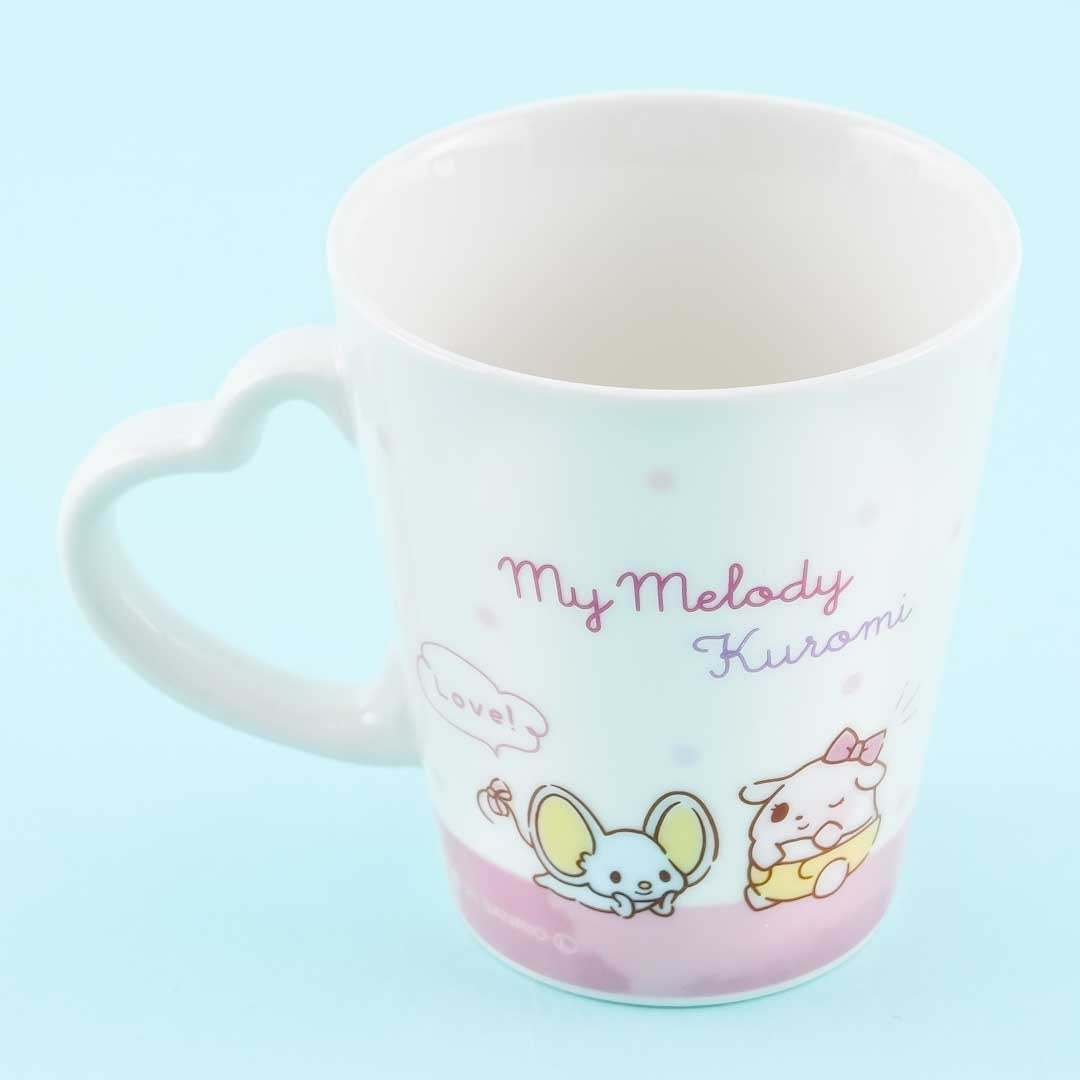 Make a cup of hot chocolate using this super cute ceramic mug! It's illustrated with a print of Kuromi and My Melody. This mug has a heart-shaped handle. You can use this mug in the dishwasher, dryer, and microwave.