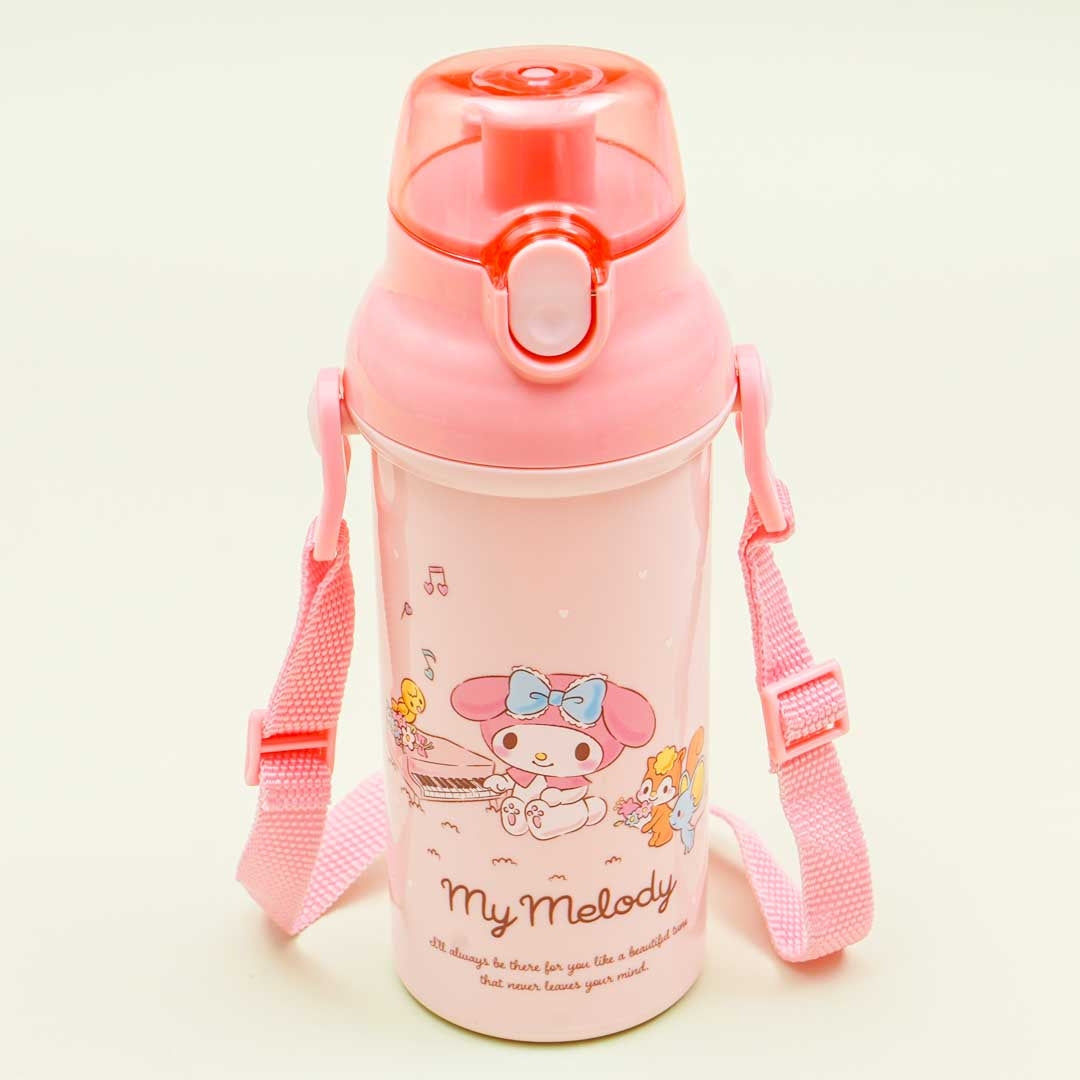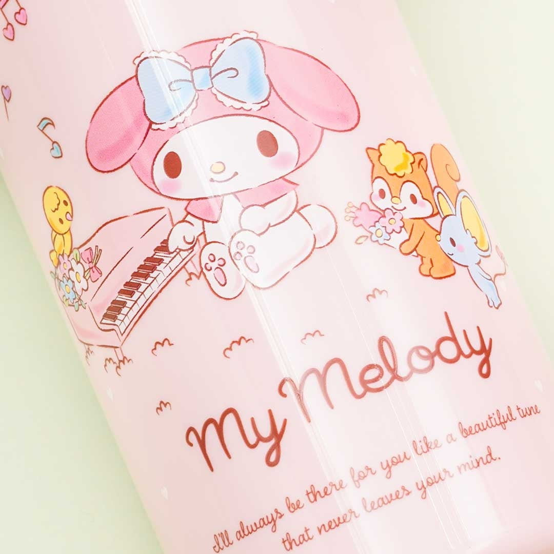 A kawaii drinking bottle featuring illustrations of My Melody playing the piano