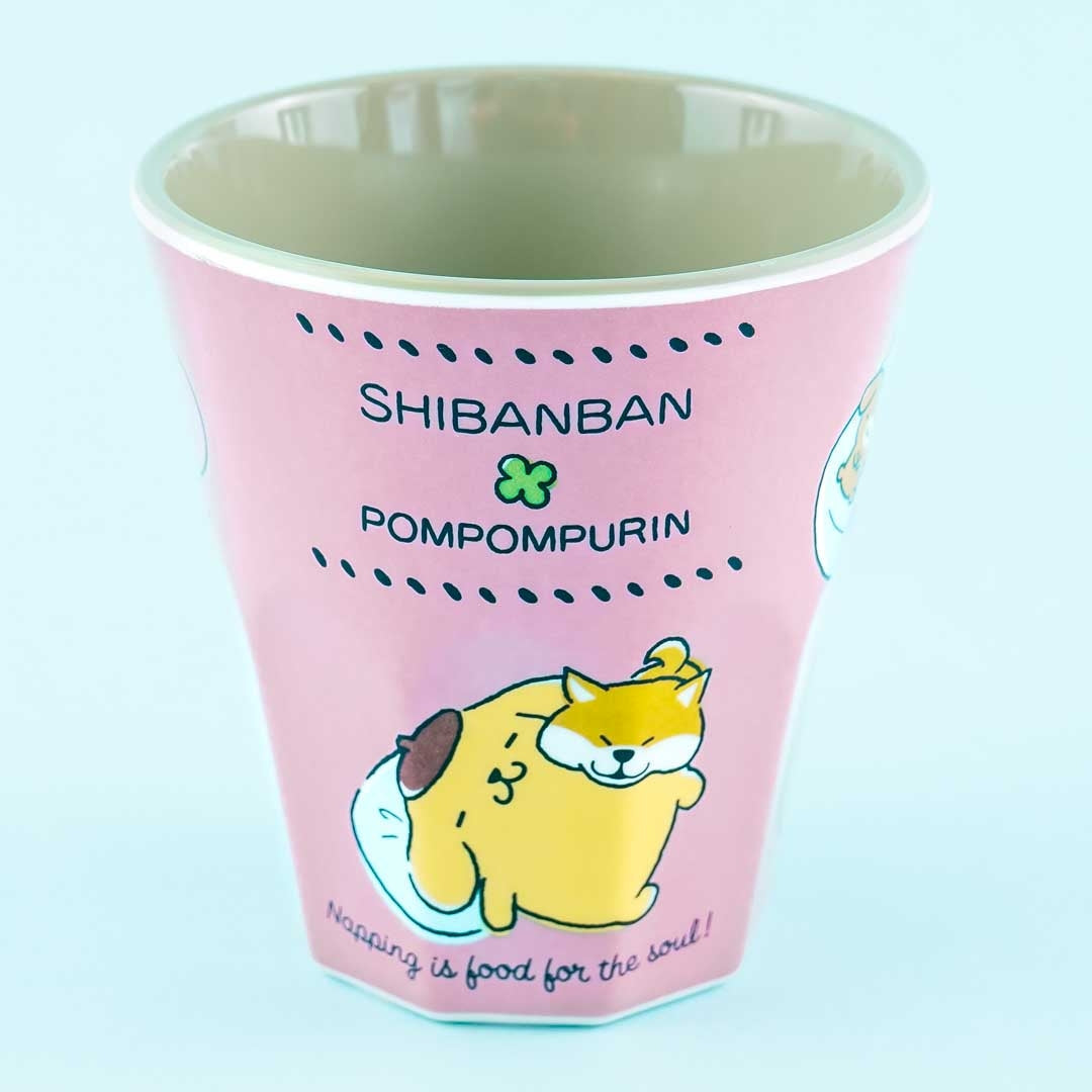 A cute drinking cup with illustrations of Pompompurin and Shibanban sleeping beside each other