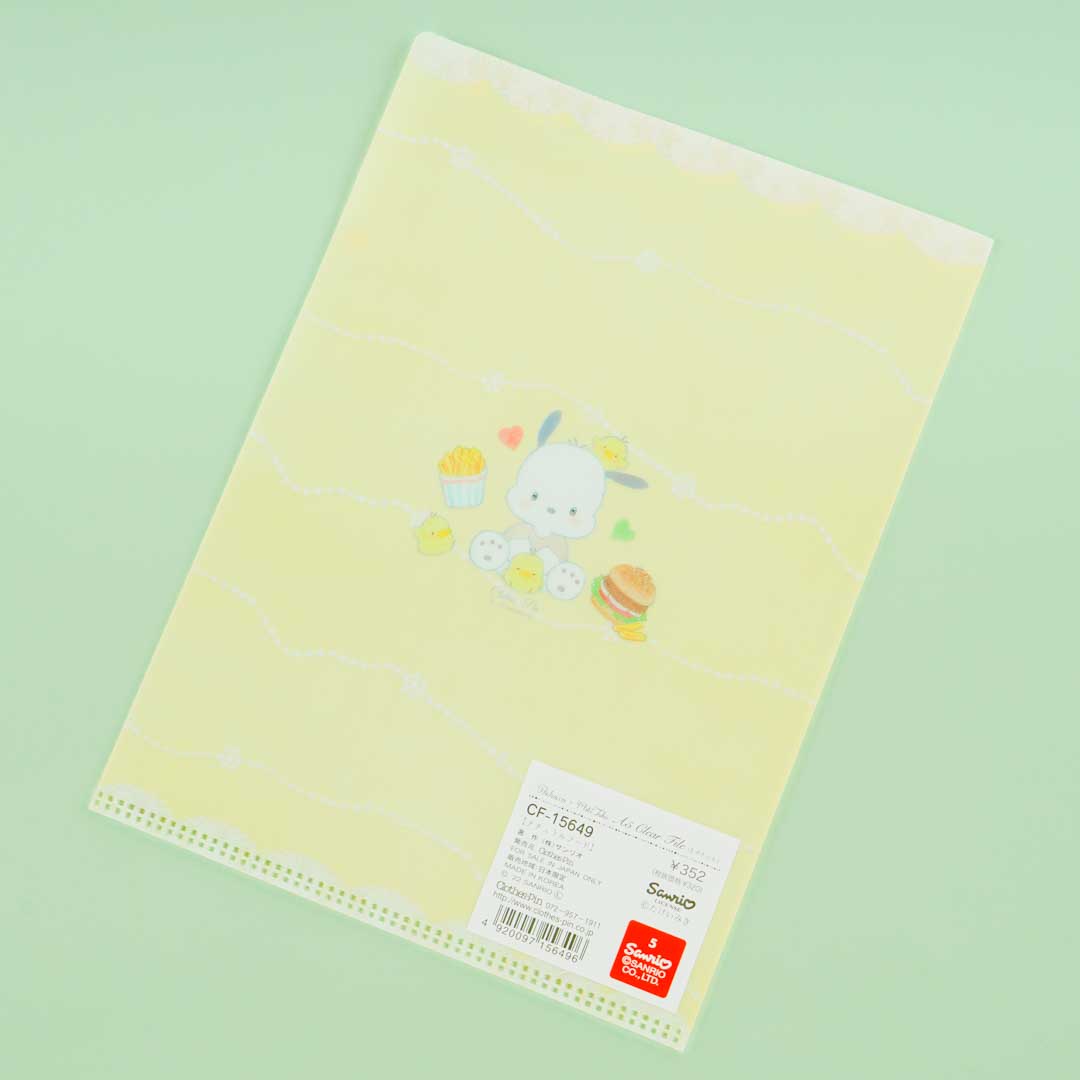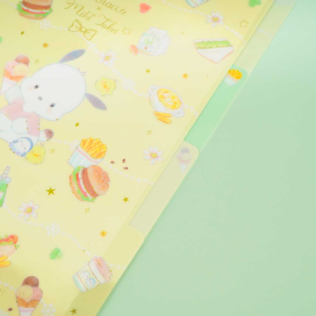 This kawaii clear file is decorated with prints of Pochacco surrounded by his favorite snacks like burgers, sandwiches, fries, and more! These cute illustrations are specially made by Japanese artist, Miki Takei. Use this index folder with three separate pockets to keep your files safe and dry!