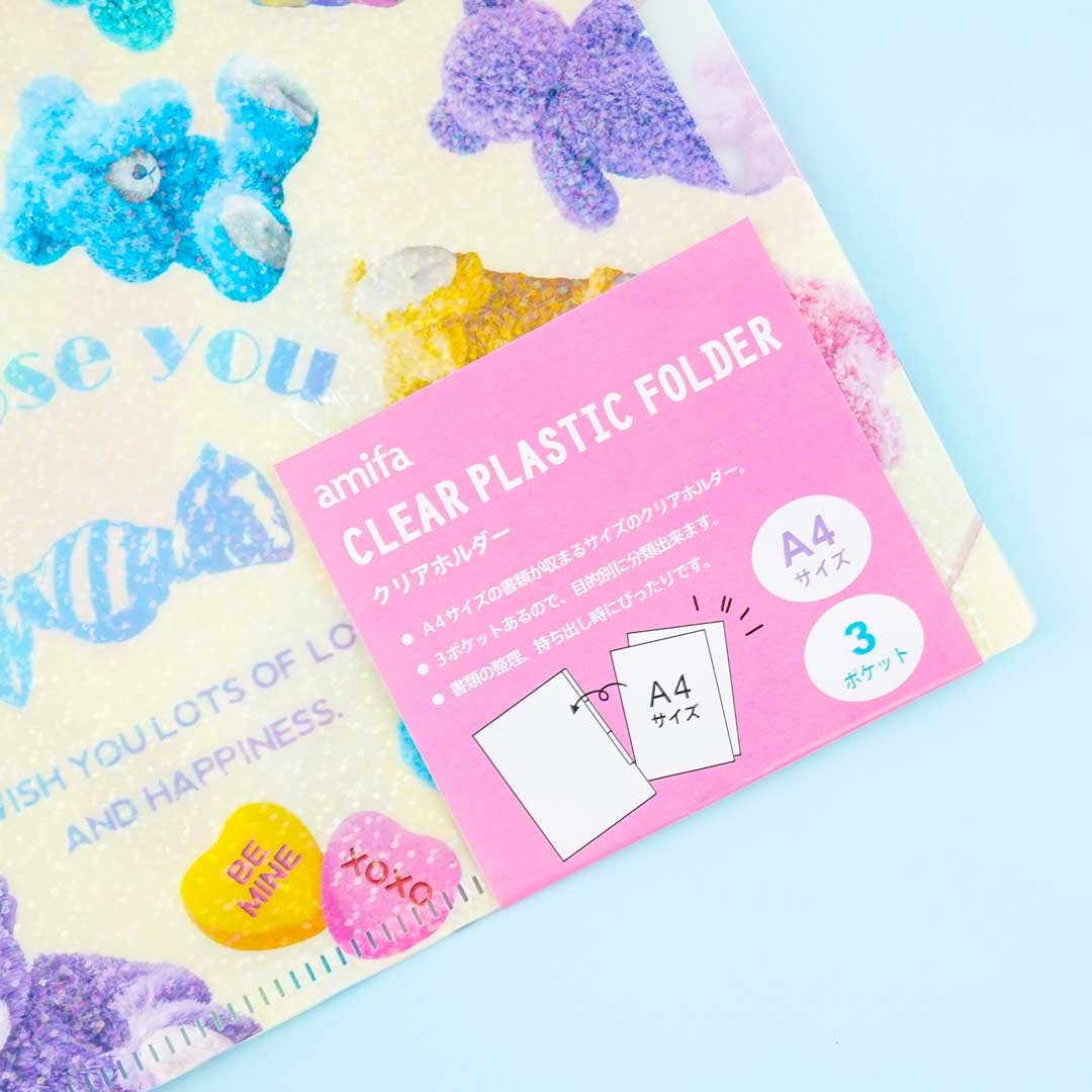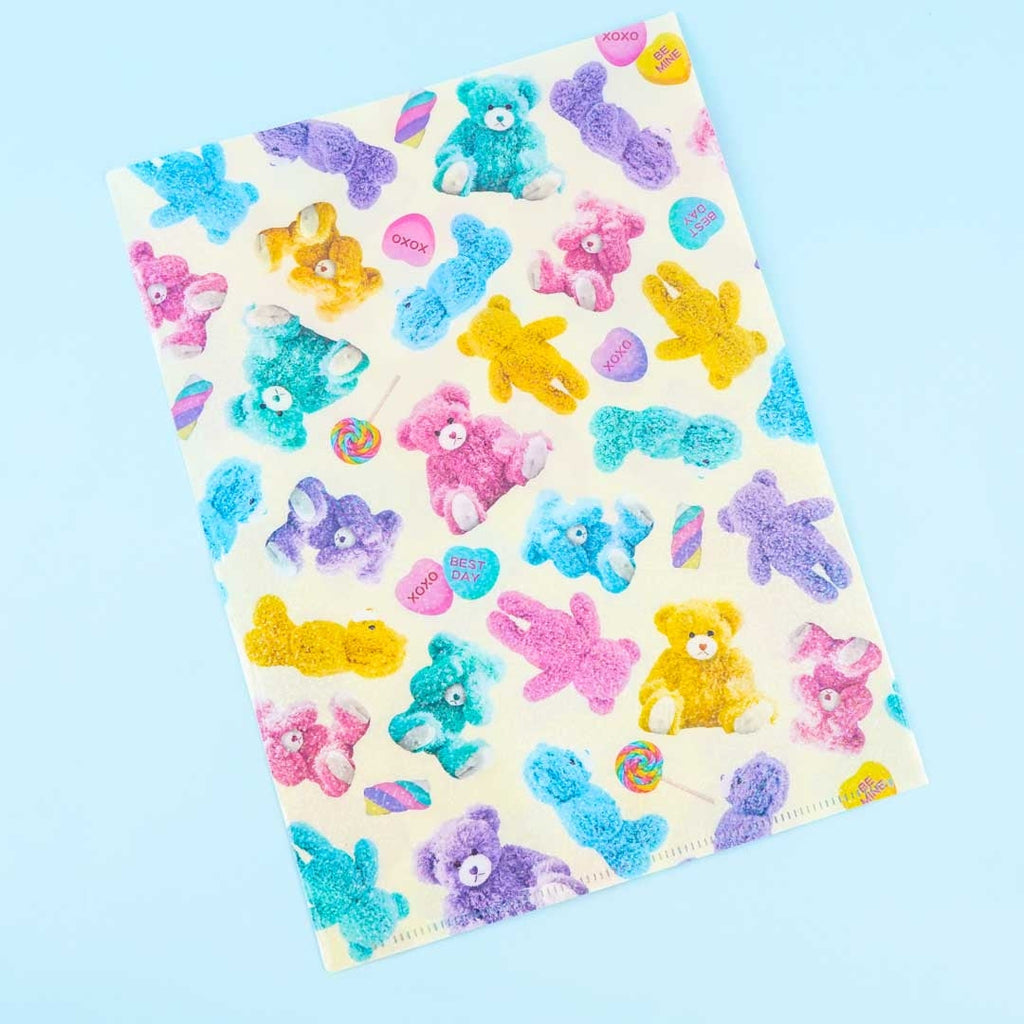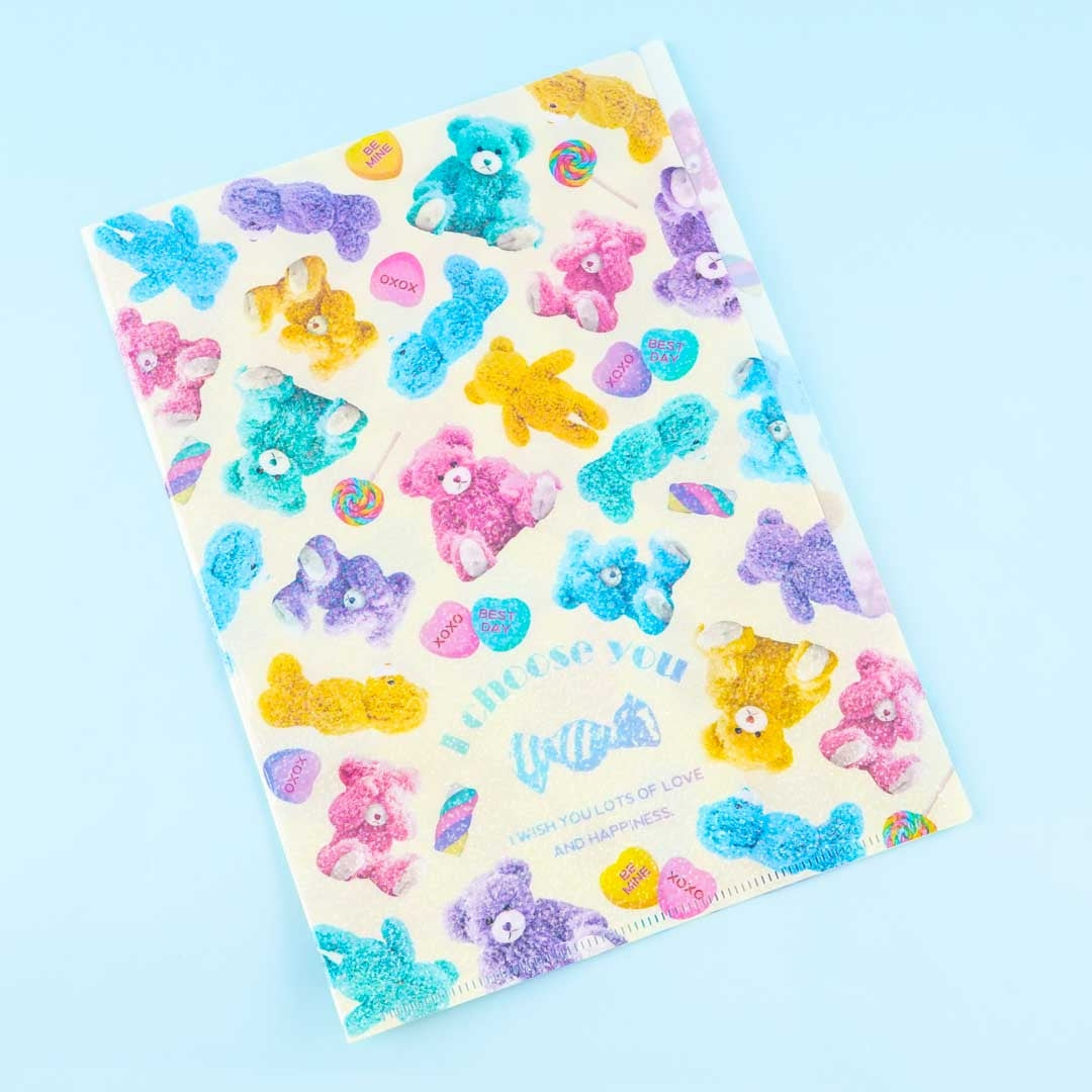 A kawaii A4 plastic folder decorated with bears and rainbow-colored candy