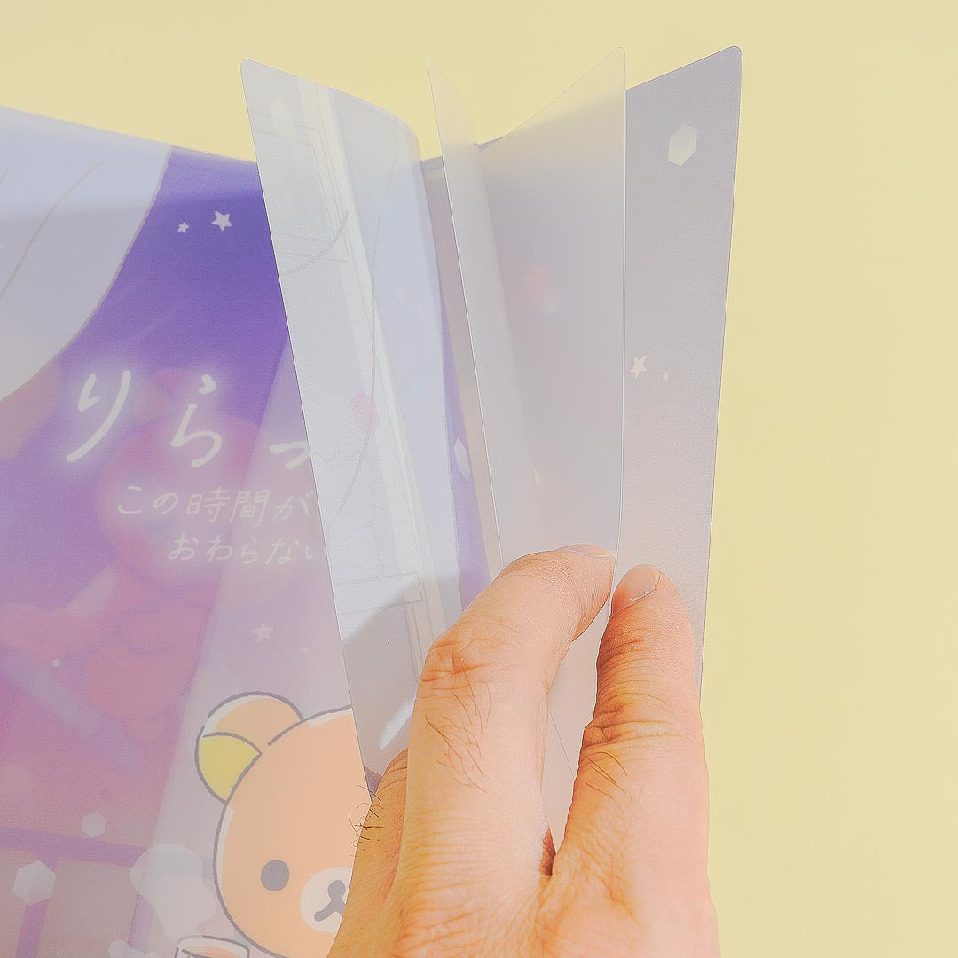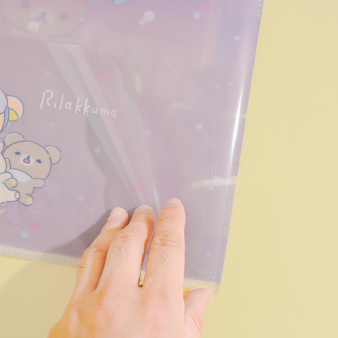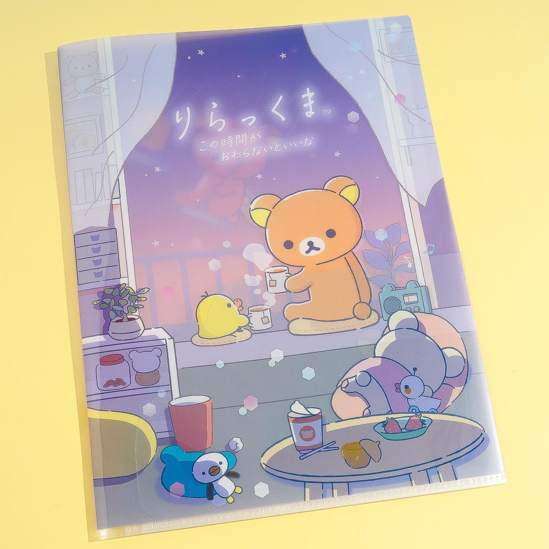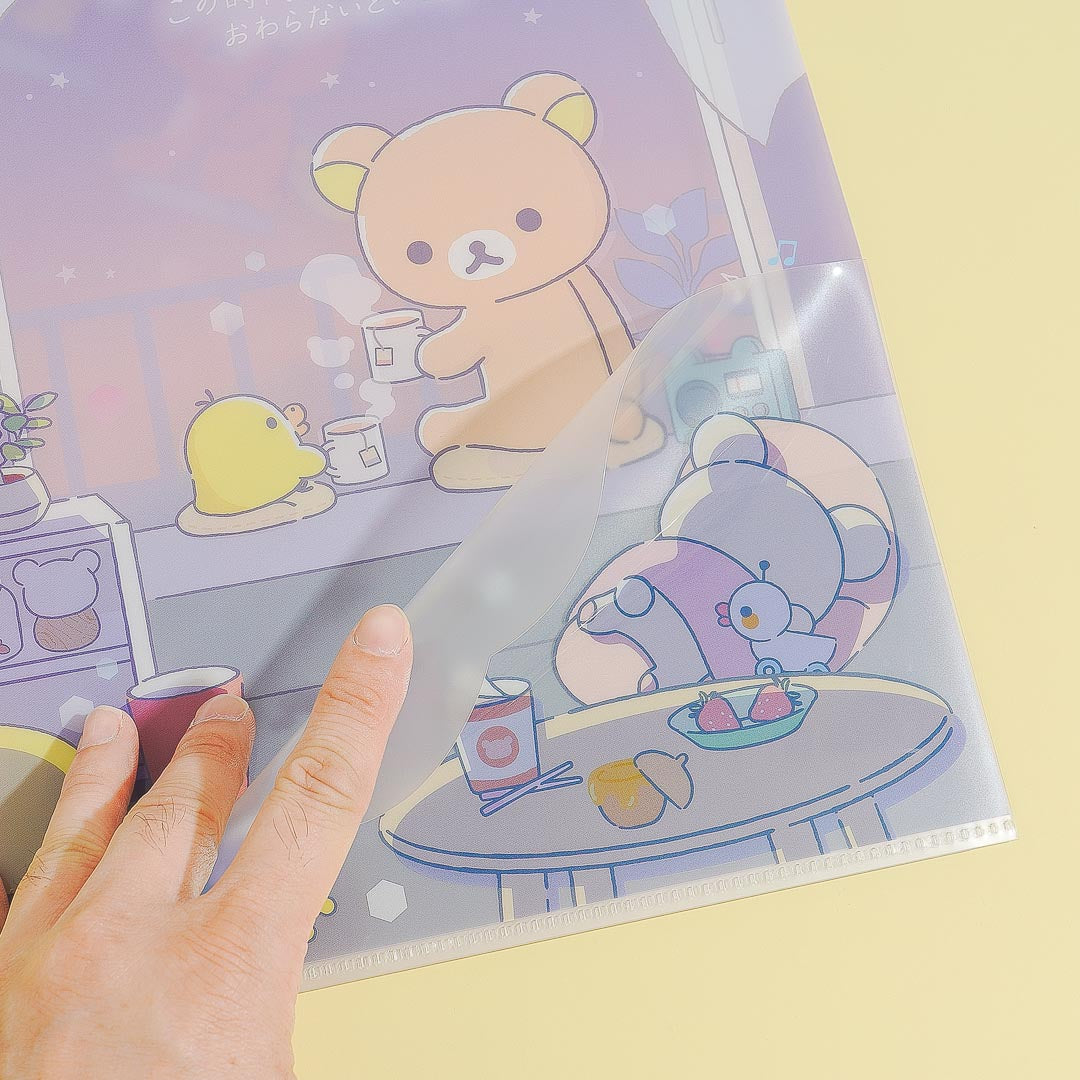 Use this cute clear file folder to store your documents. It features prints of Rilakkuma and his buddy Kiiroitori having some tea at night! This clear folder has a pocket to keep papers in place.