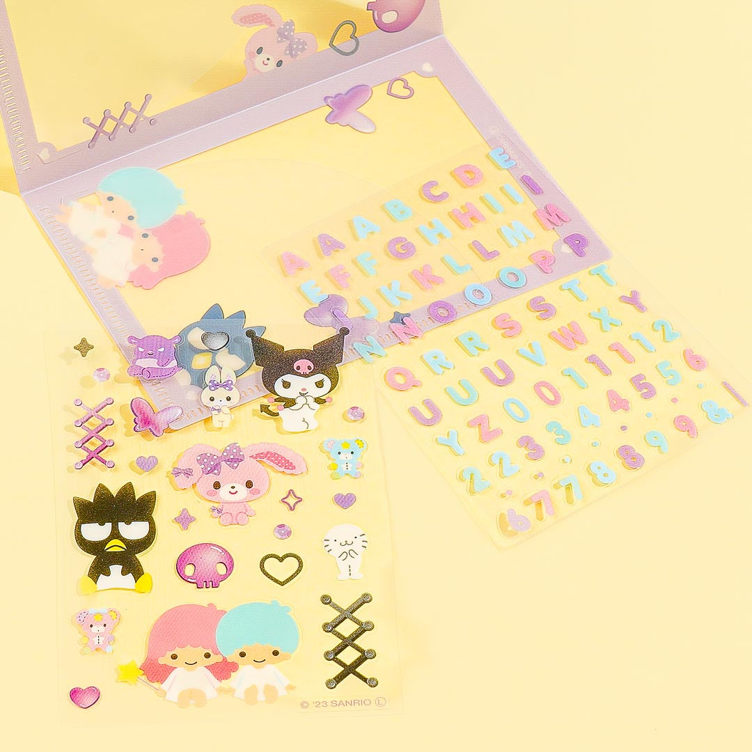 Customize your favorite poca or photocard by using this super set! It includes a mini clear file with purple borders and kawaii illustrations of iconic Sanrio Characters like Kuromi, Bad Badtz-Maru, and the Little Twin Stars! You can unleash your creativity even more by decorating it using the included sticker sheets.