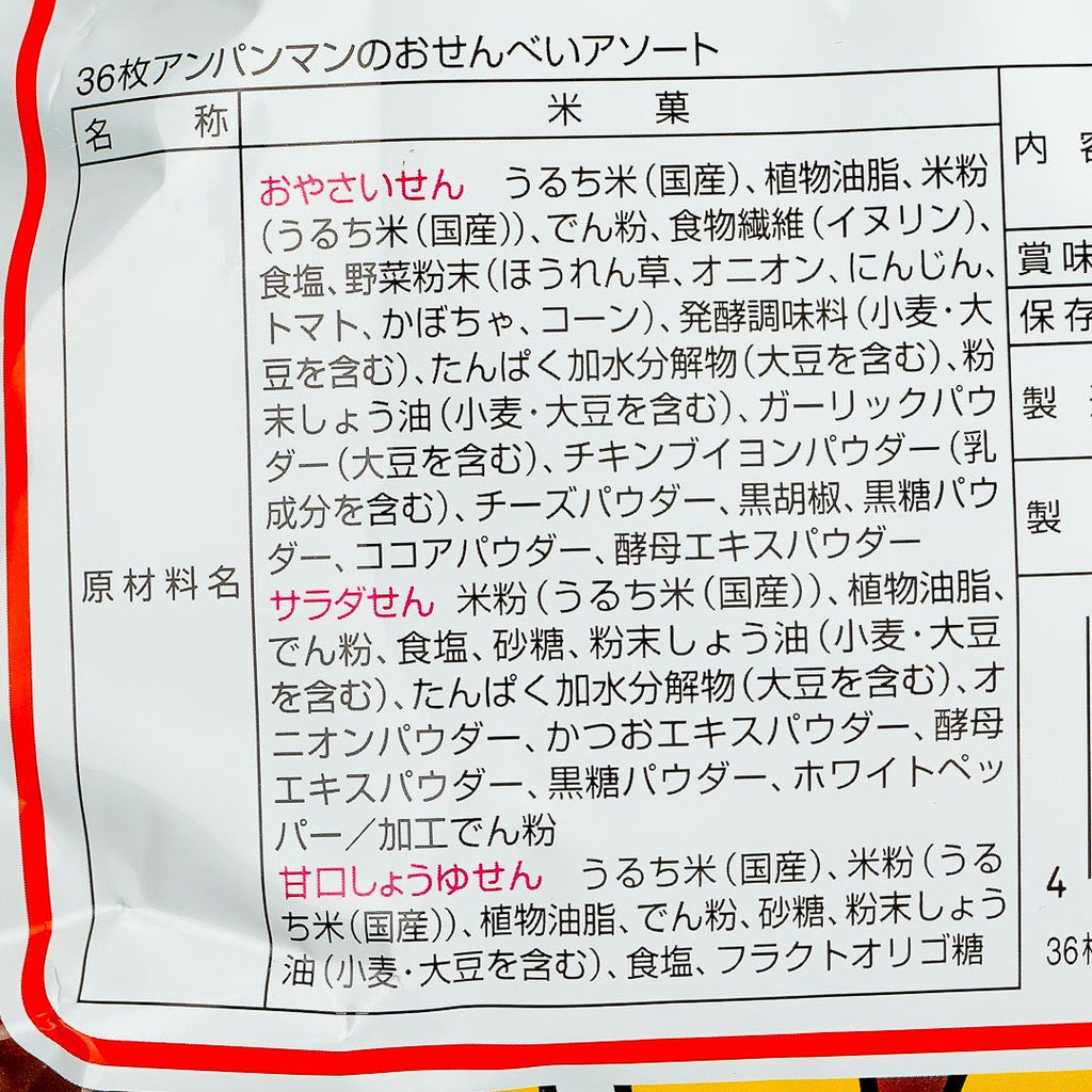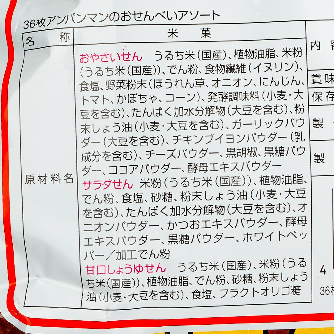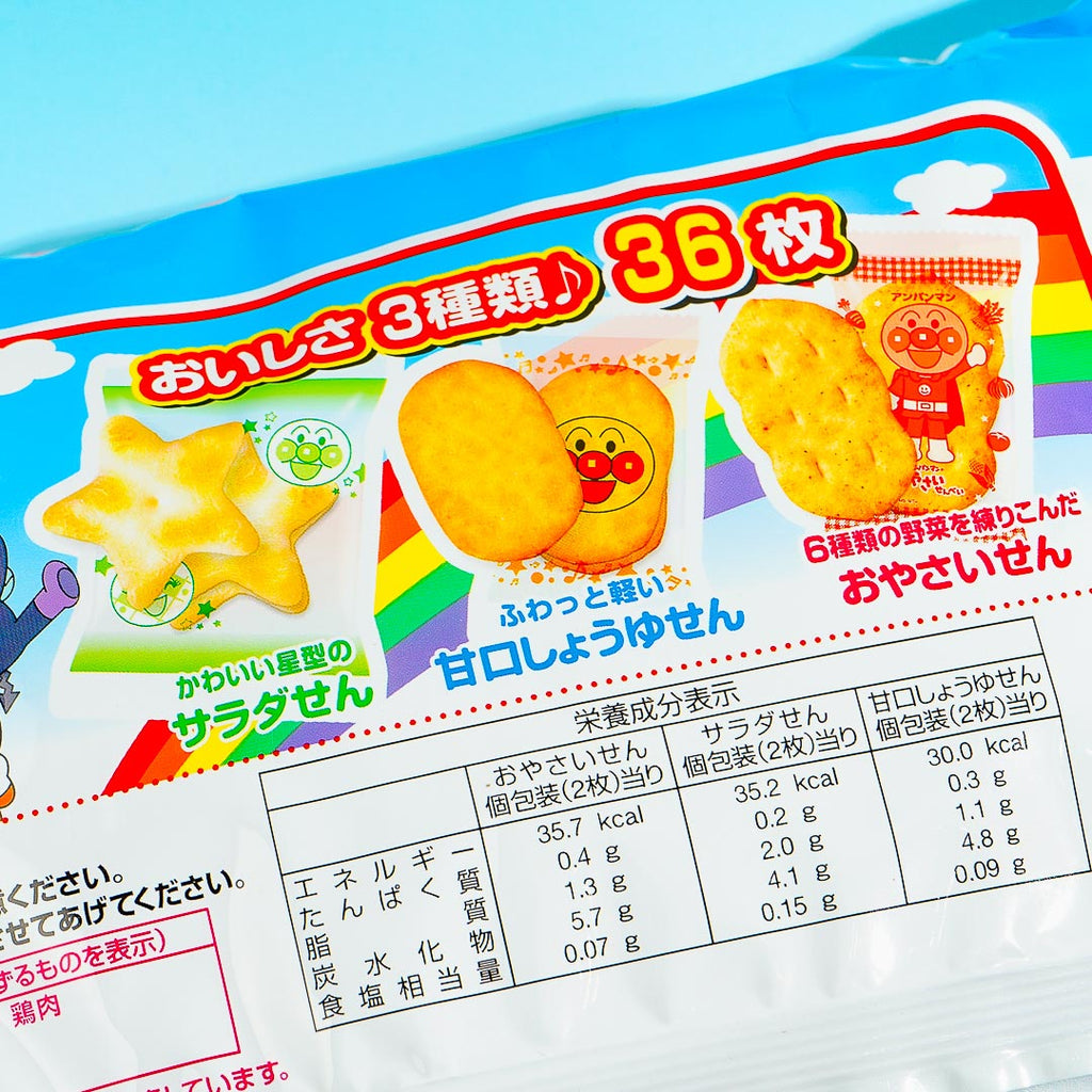 Serve senbei or Japanese crackers at your next party! This snack bag contains three types of rice crackers with different shapes and flavors. The crackers come in individual packaging featuring prints of Anpanman.