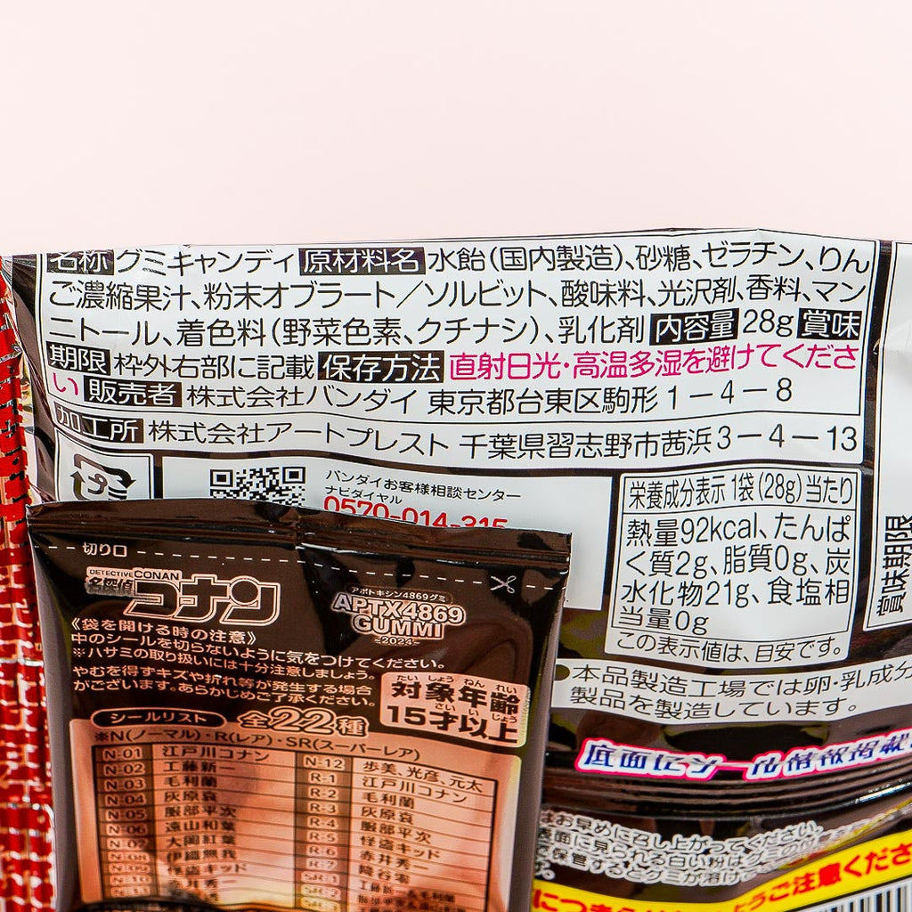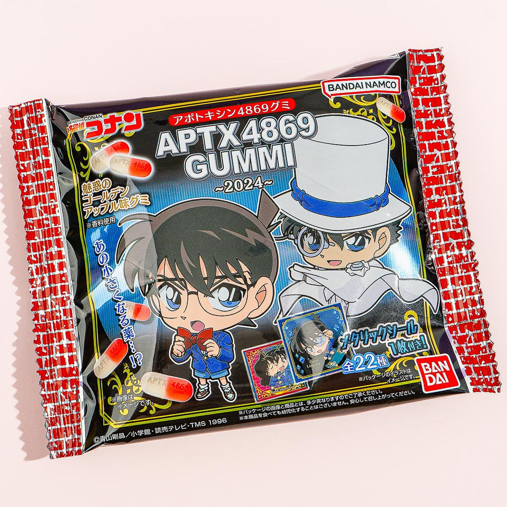 Stash away this pack of gummies featuring prints of Detective Conan characters in your anime snack bin. Each refreshing apple-flavored gummy piece is made to look like APTX 4896, a toxin that plays an important part in the story of Detective Conan.