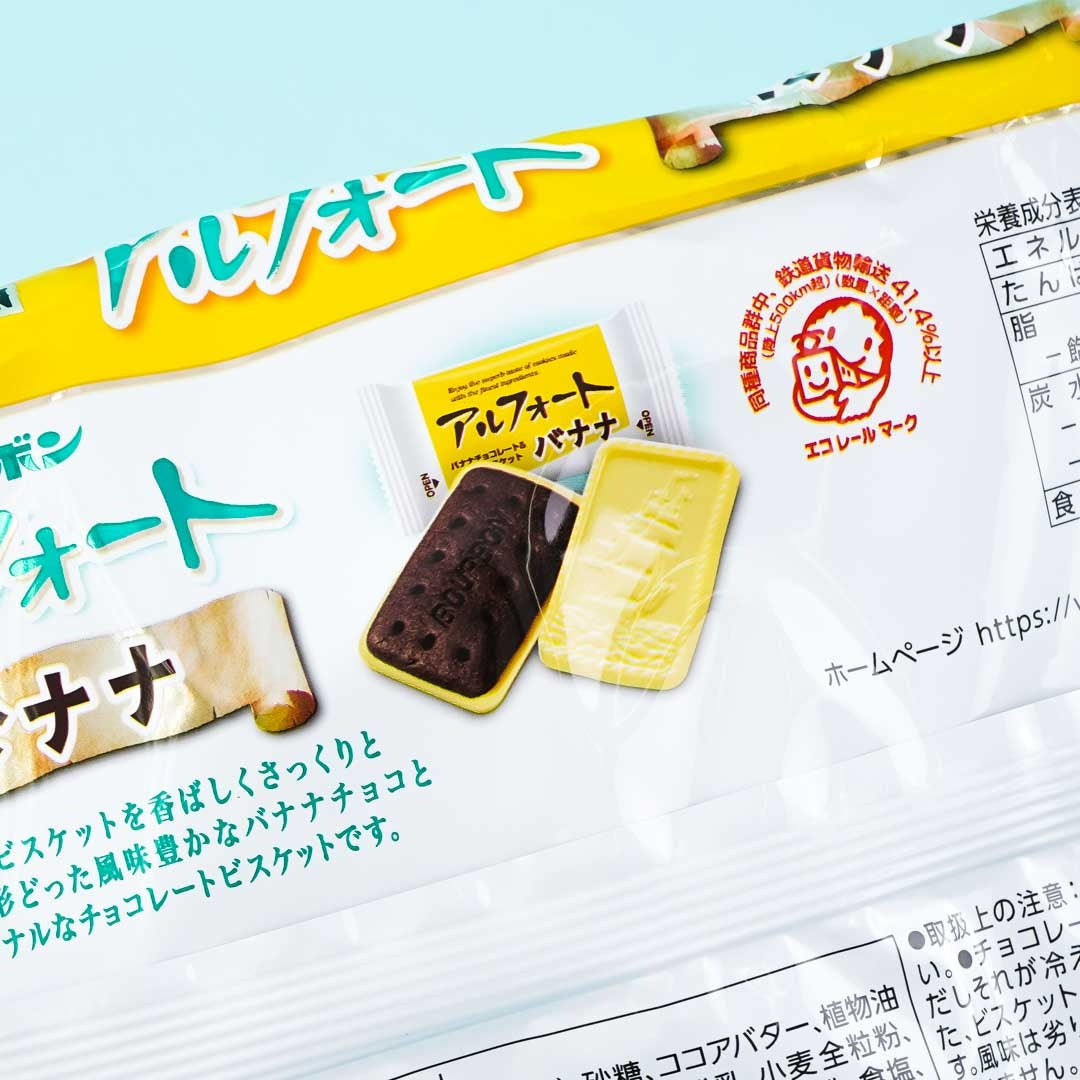 A box of crunchy bittersweet cocoa biscuits coated with sweet banana-flavored chocolate