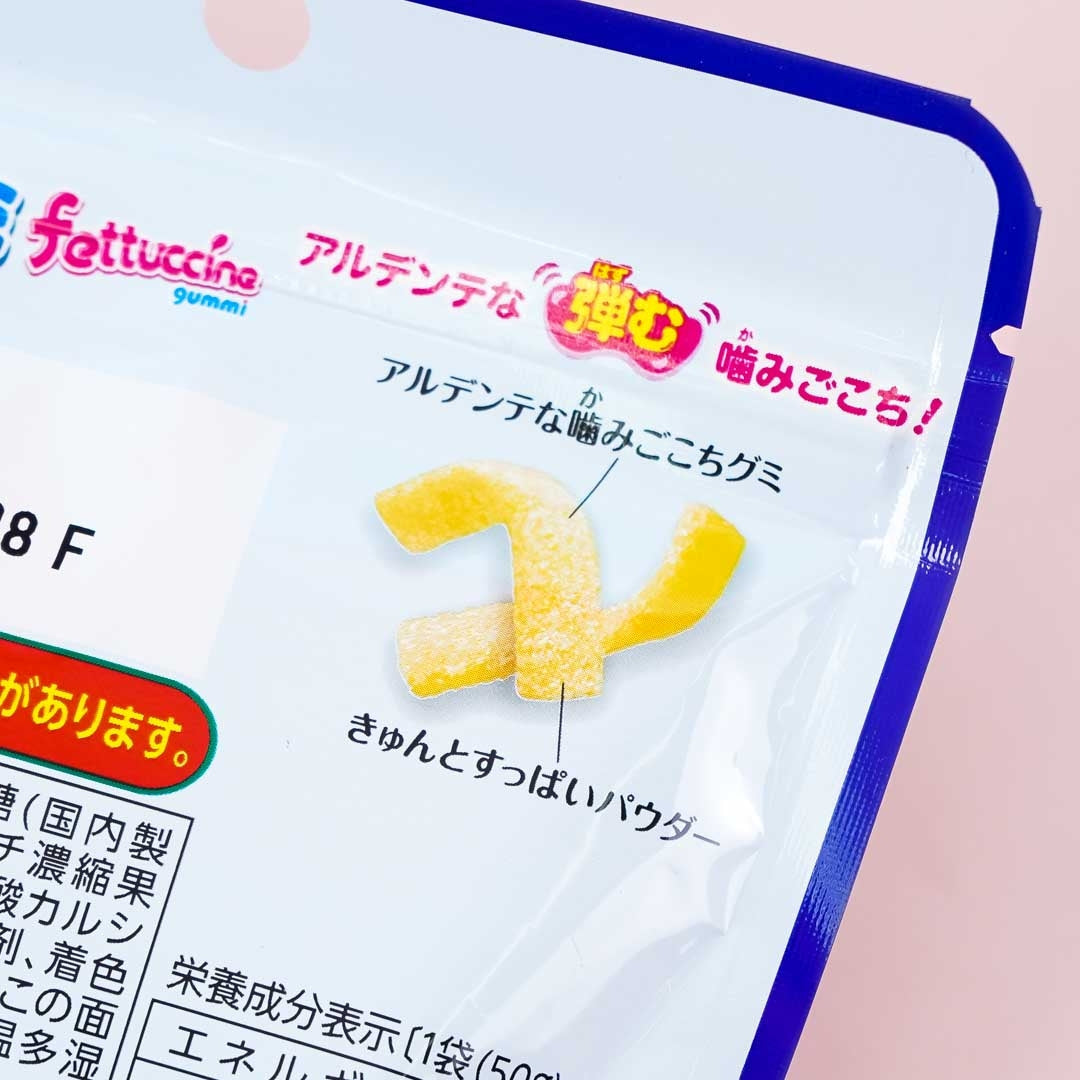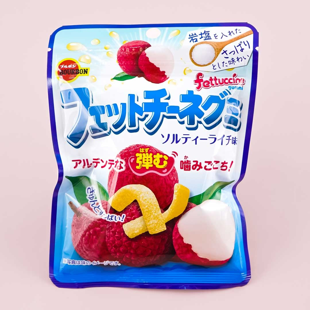 A pack of pasta-shaped gummies with salted lychee flavor and coated with sour powder and sugar