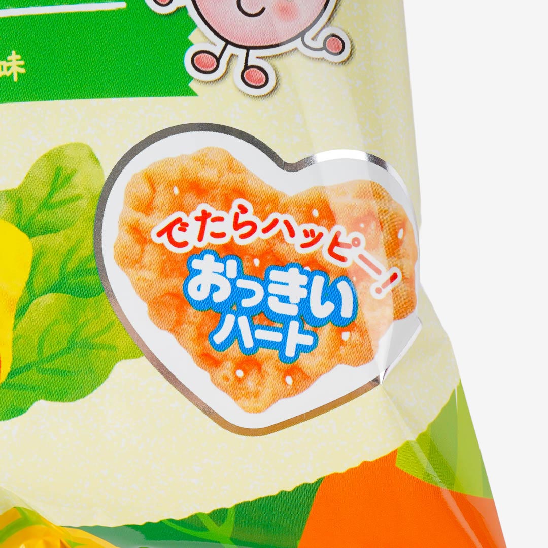 A pack of heart-shaped snacks made with five green and yellow vegetables