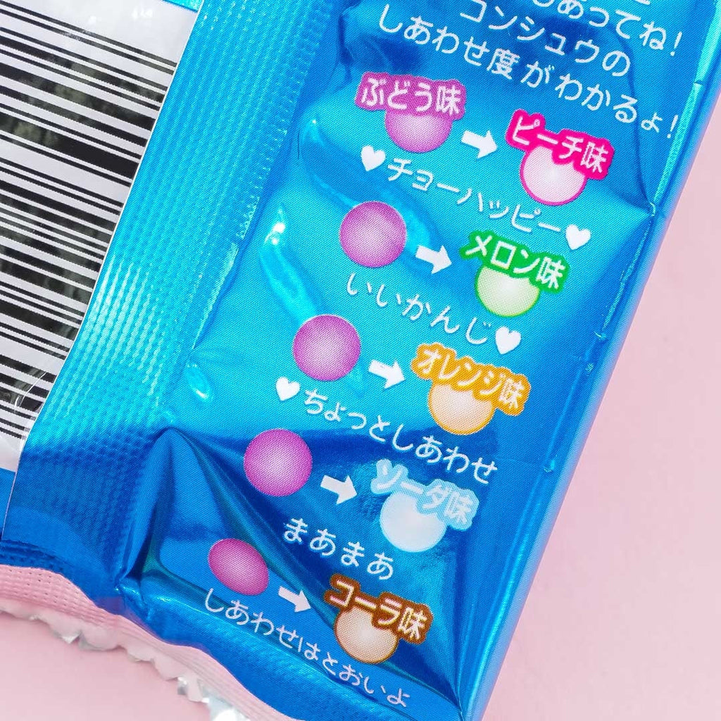A pack of ramune candy that first tastes like grape and then will change into a different flavor like peach, melon, orange, soda, or cola