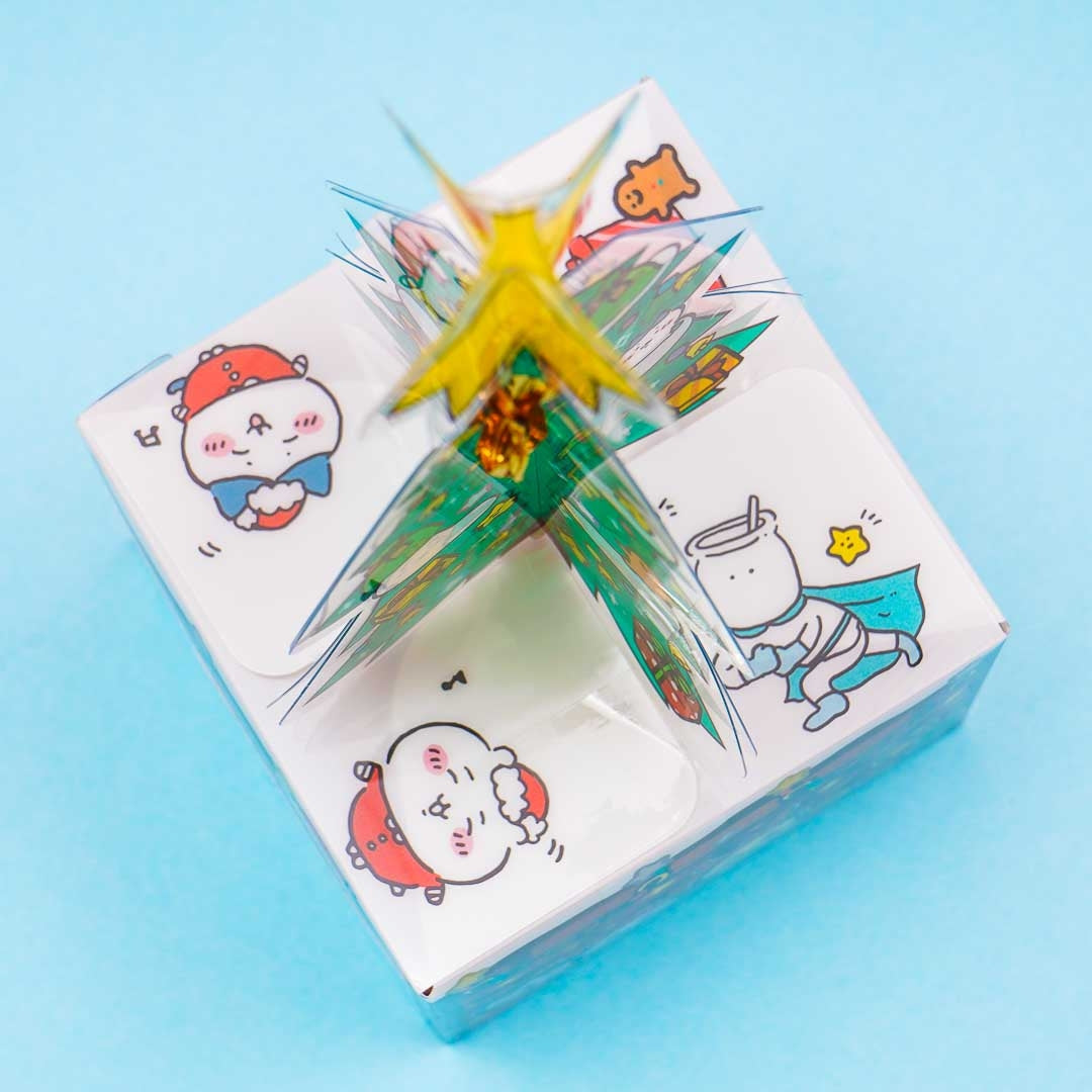 A box of candy with a fun Christmas tree-shaped design showcasing prints of Chiikawa characters