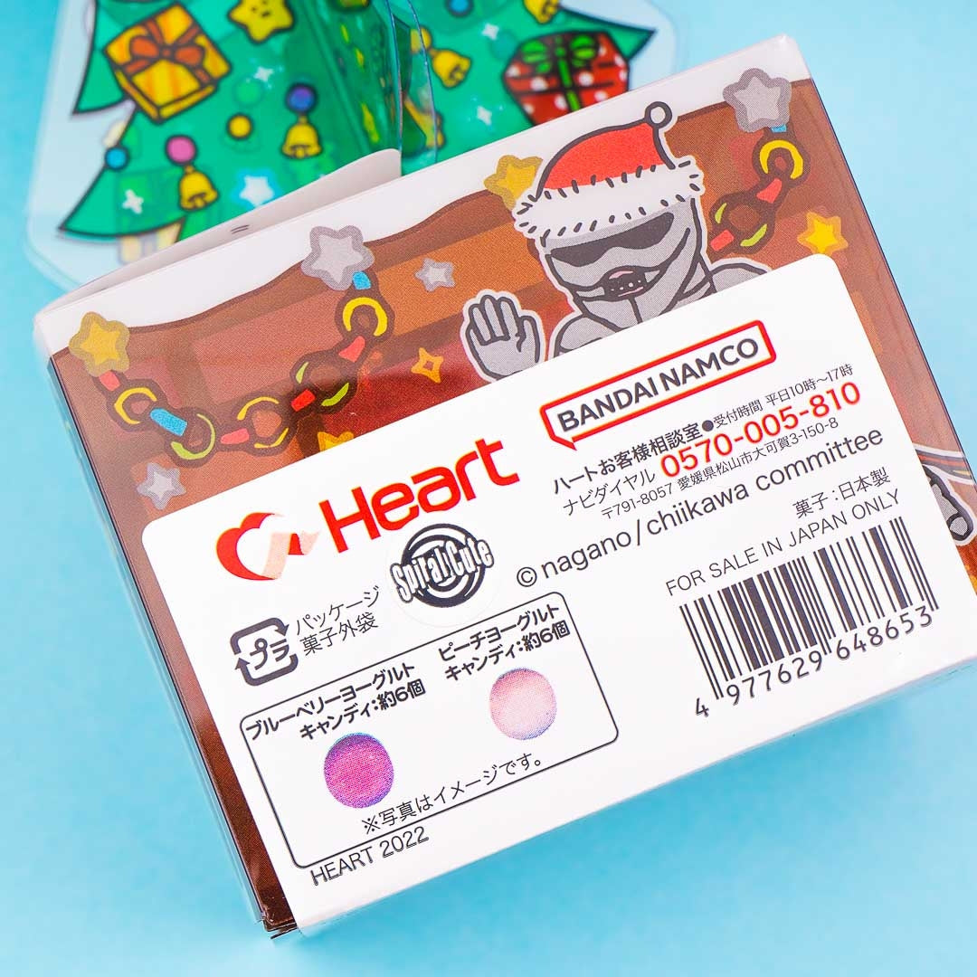 Celebrate the holiday season with this mini box of candy decorated with prints of Chiikawa characters. It has two different candy flavors for you to enjoy - blueberry yogurt and peach yogurt! This box of candy also has a fun tree-shaped design.