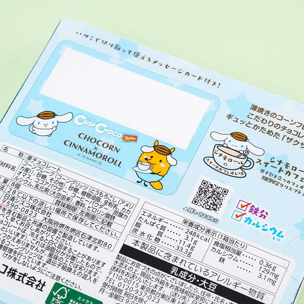 This yummy and limited-edition box of cornflake snacks celebrates Cinnamoroll's 20th anniversary! Enjoy the delicious sweet café au lait flavor of these crispy treats. Each piece contains iron and calcium. Surprise yourself with a random box design when you order! On the back of the box is a message card randomly selected from a set of 3 different designs that can be used as a gift for your family and friends!
