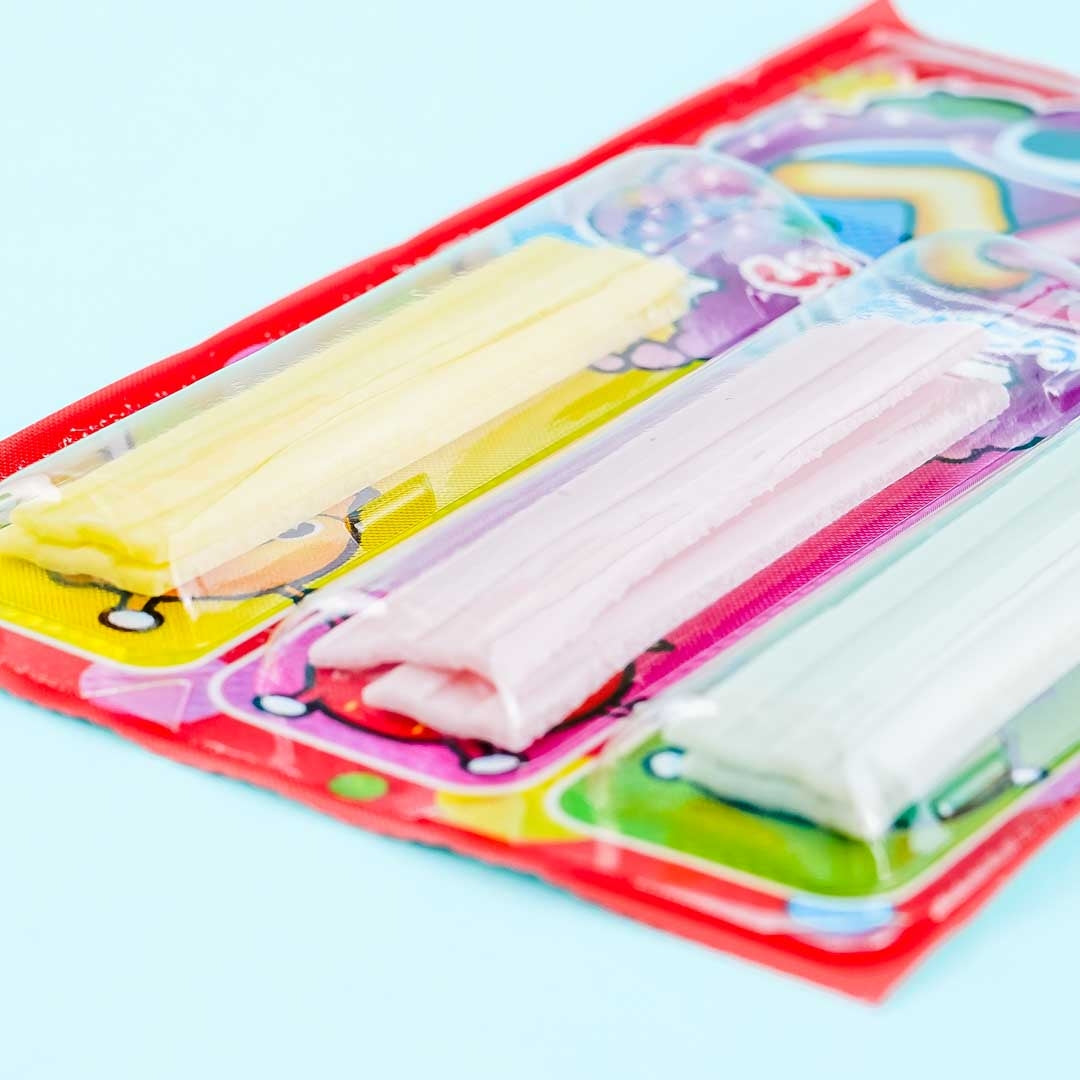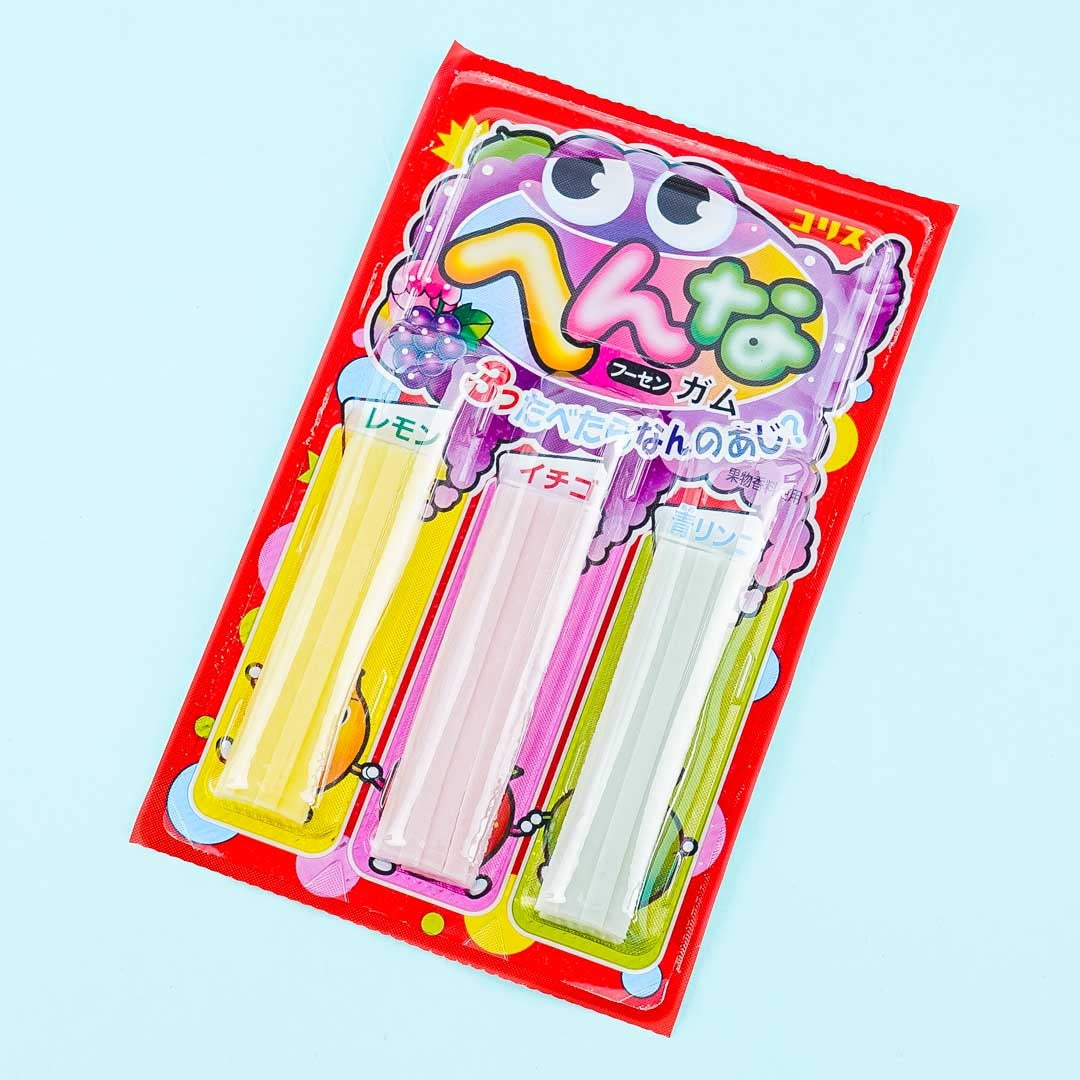 Try chewing two or three of these gum sticks together and you will always taste sweet grapes! These funny-looking treats that looked like noodles come in lemon, strawberry, and green apple flavors.