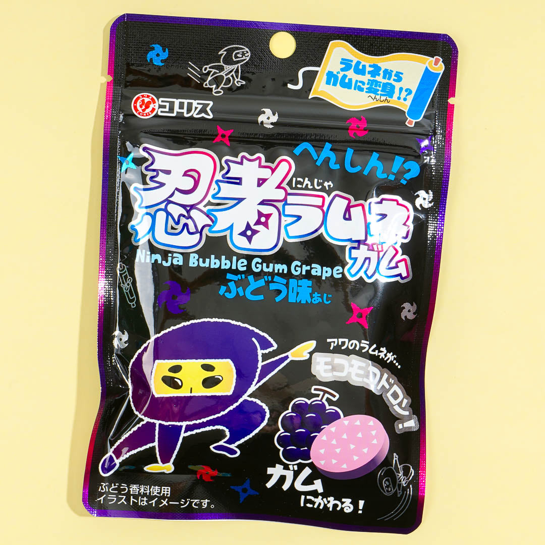 Have fun eating this unique treat that's fit for a ninja! It starts as a fizzy ramune candy but transforms into bubble gum when you put it in your mouth. This grape-flavored candy comes in a resealable pack.