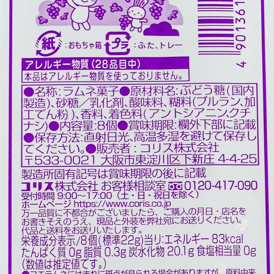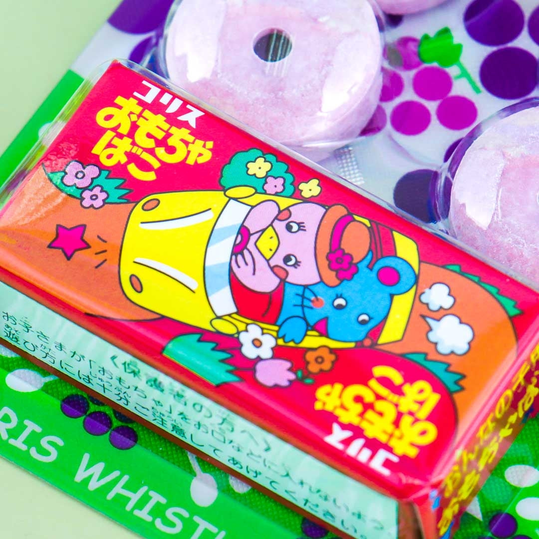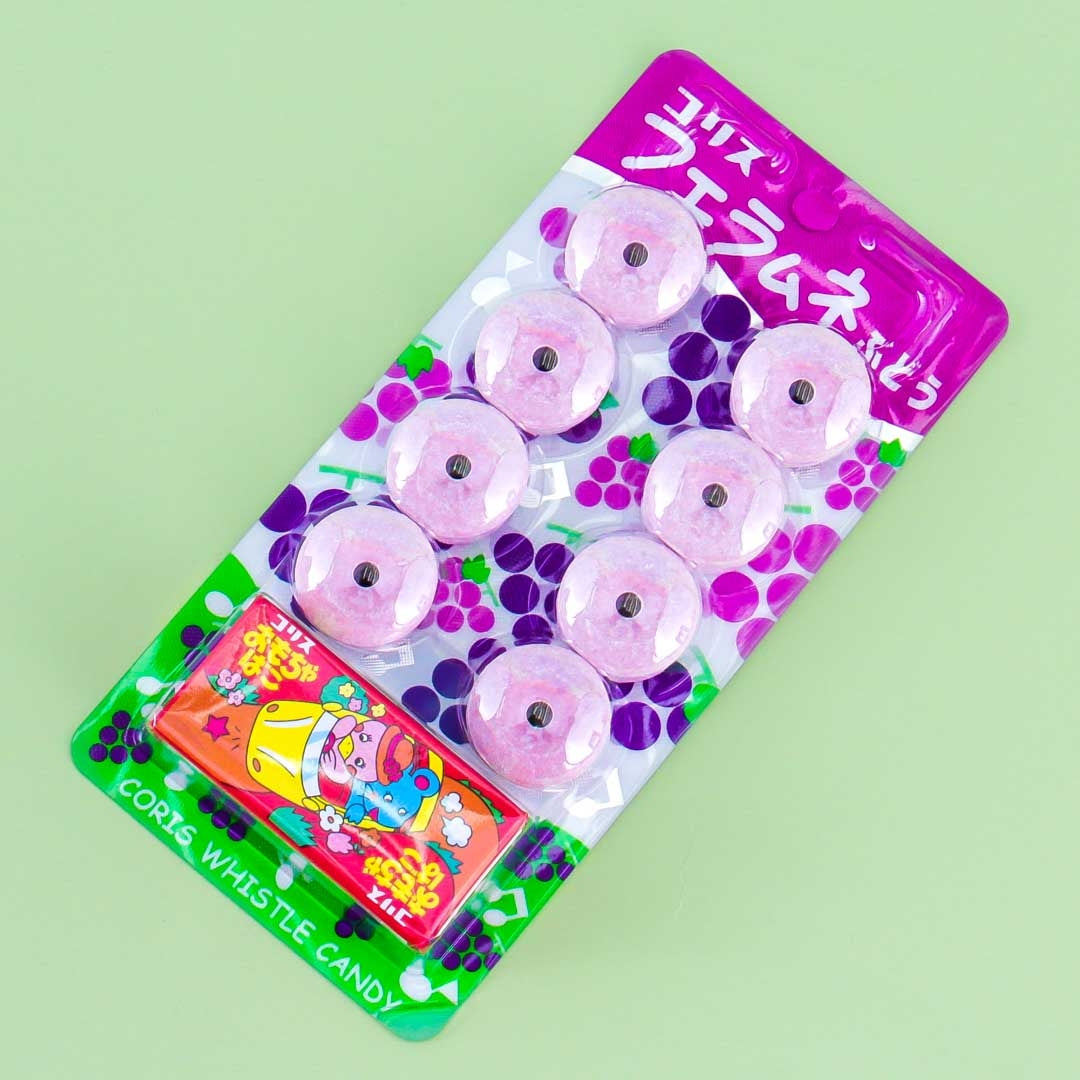 Turn your candy into music! Each pack of these Coris Whistle candies contains 8 yummy grape flavored and doughnut-shaped candies that make a whistling noise when you blow through the hole in the middle! Each pack also contains a fun surprise toy. These unique and fun Japanese candies are a must-try!