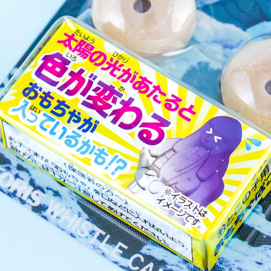 Practice whistling with these sweet cola-flavored candies! This pack of donut-shaped Japanese candies comes with a mystery toy that changes color when facing the sunlight.