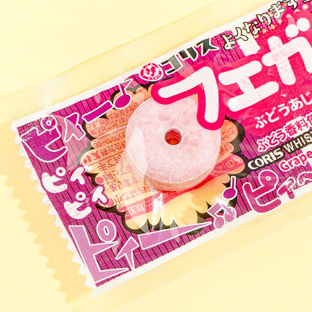 Have fun chewing on this pack of donut-shaped gums! Each gum is grape-flavored and makes a whistling sound when you blow through it. You can chew the gum after playing a nice tune!