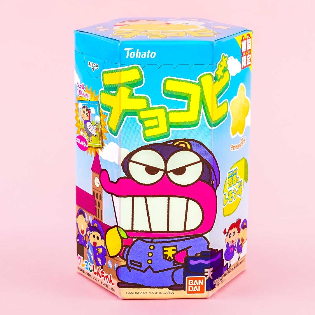This box of star-shaped corn snacks features prints of Crayon Shin-chan characters! Enjoy the revitalizing lemon flavor of these tasty treats. They come with a Crayon Shin-chan character sticker taken from a set of twenty different designs.