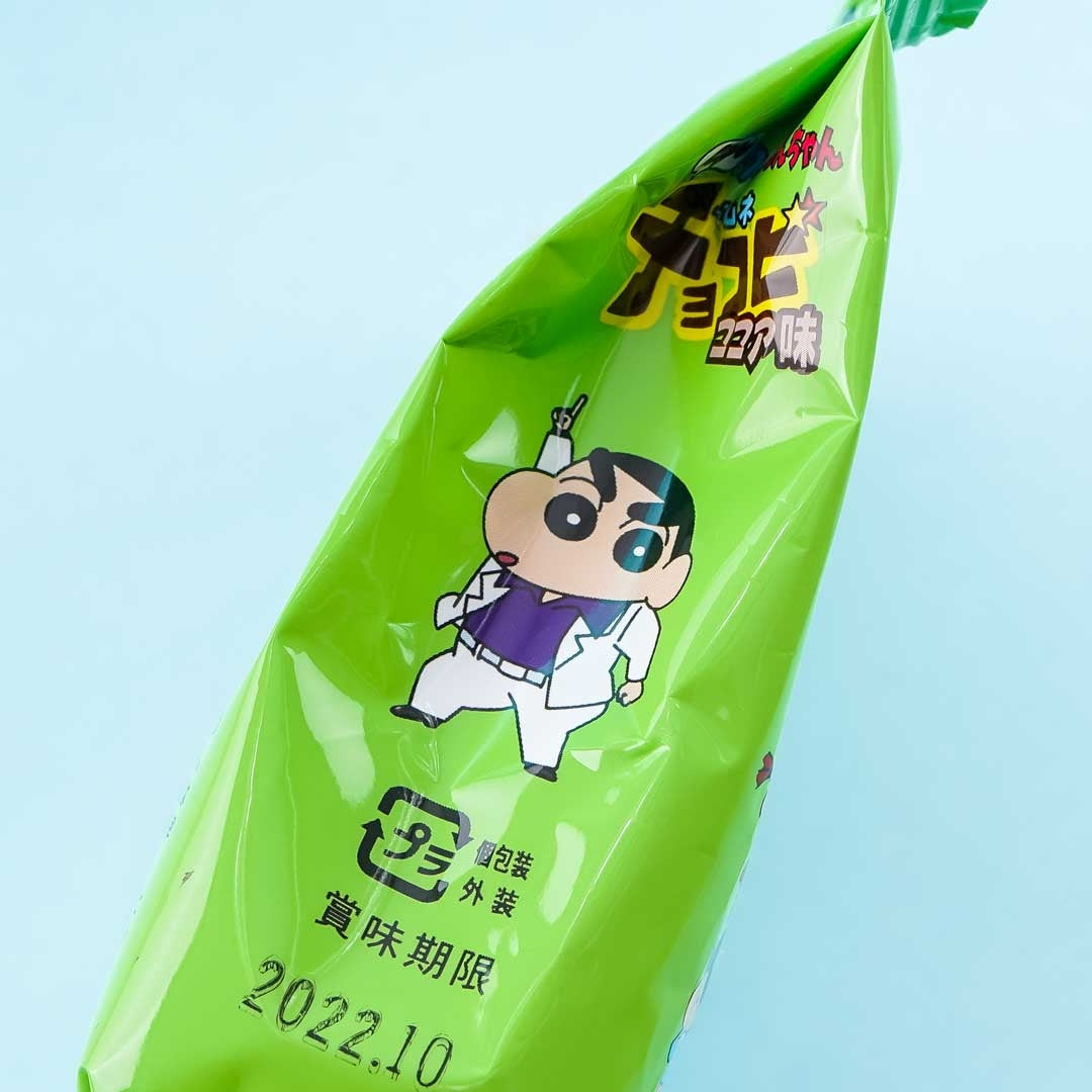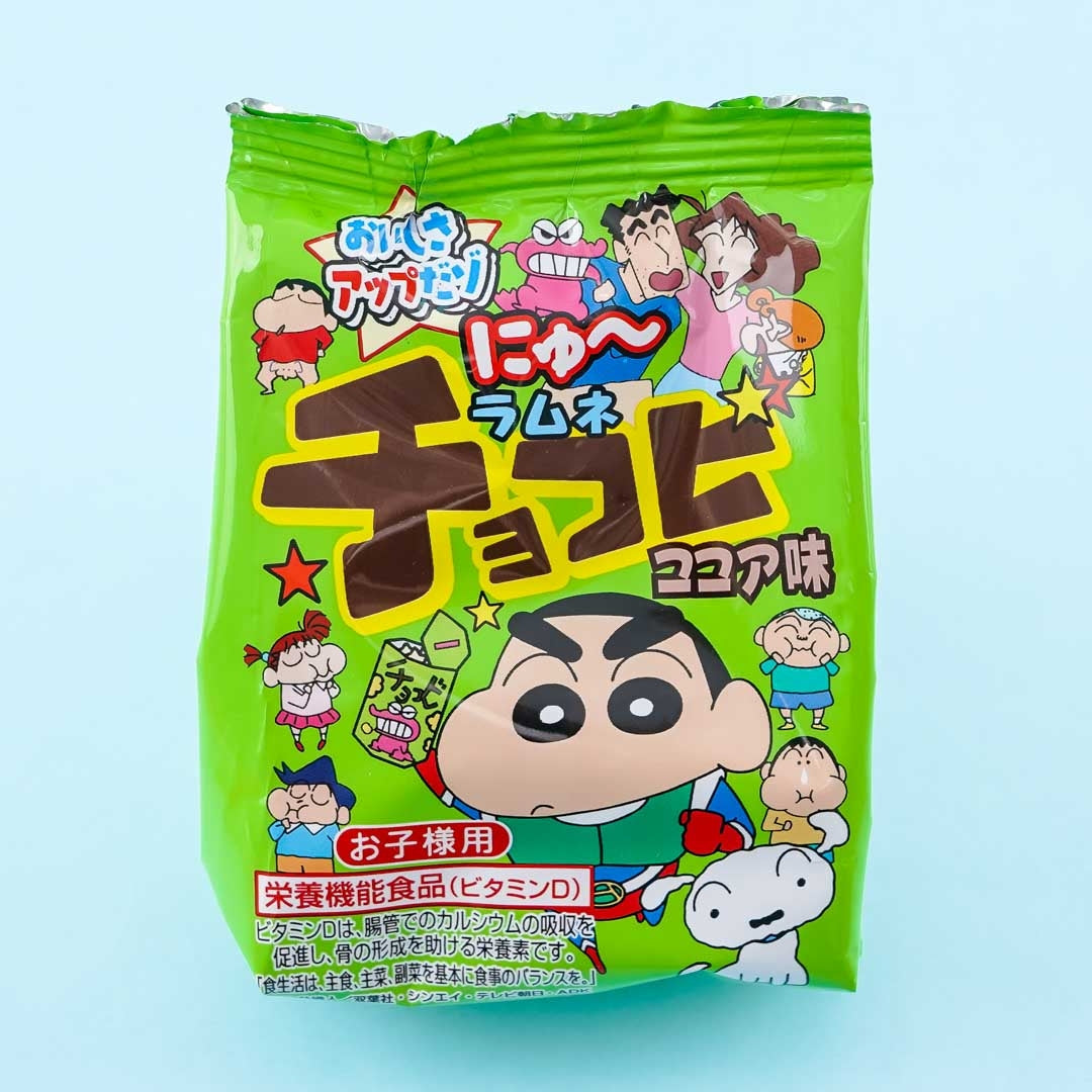 A pack of cocoa-flavored ramune candy shaped like stars illustrated with Crayon Shin-Chan characters