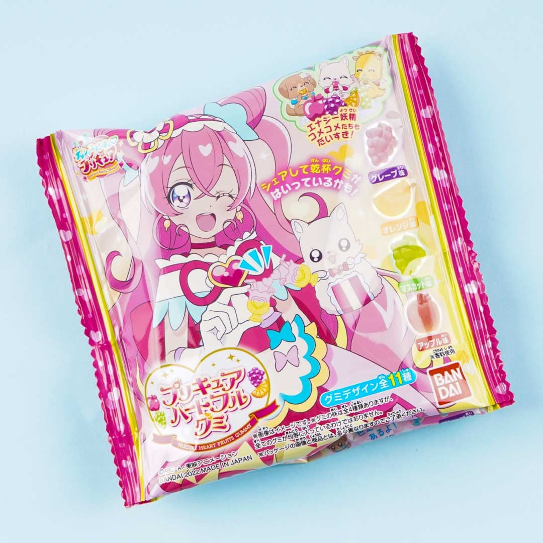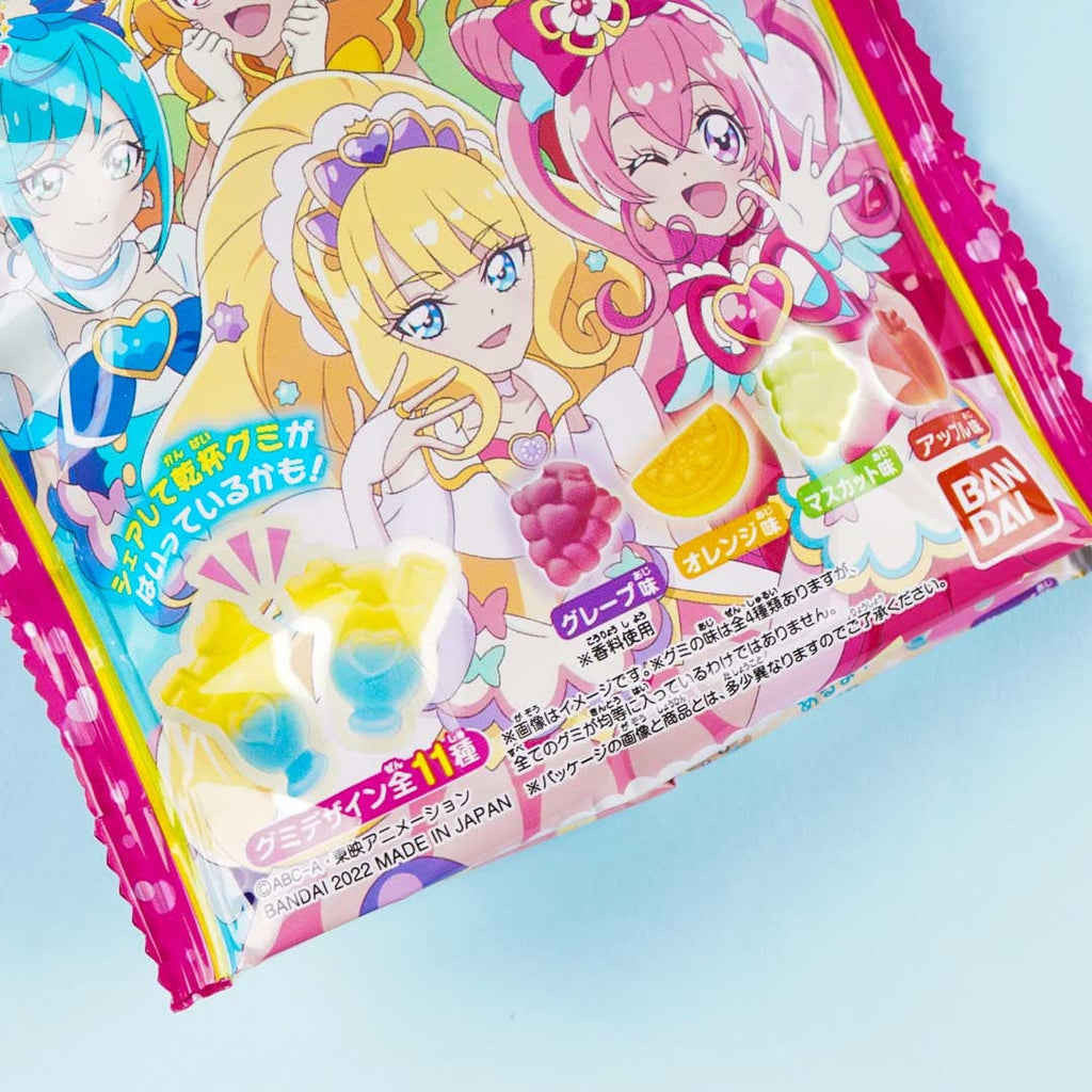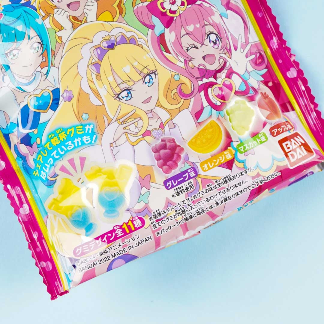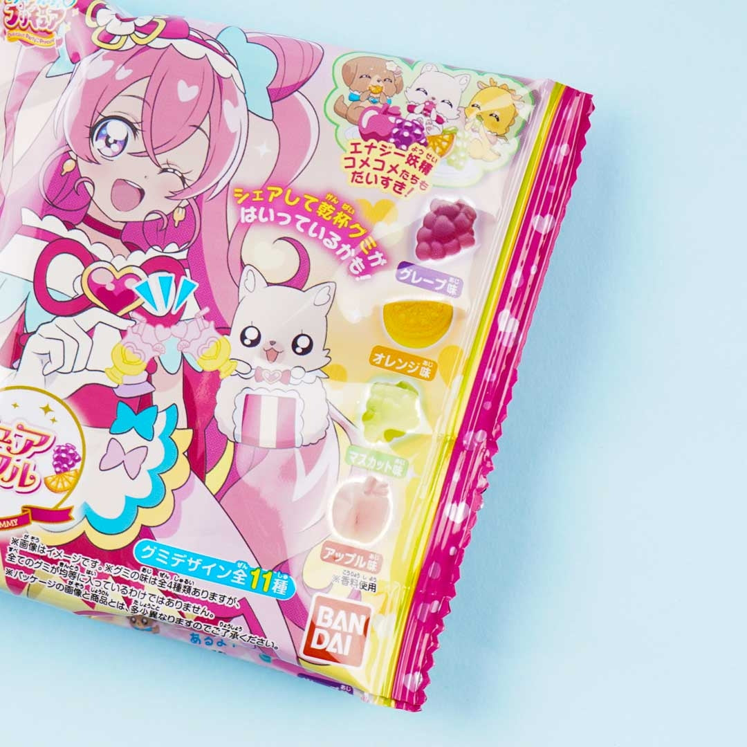 Have a blast trying out these colorful fruity gummies that come in orange, muscat, grape, and apple flavors! These soft squishy treats come in eleven different shapes — four fruit-shaped and seven that look like the magical creatures and accessories from the popular animated series, “Delicious Party Pretty Cure!”