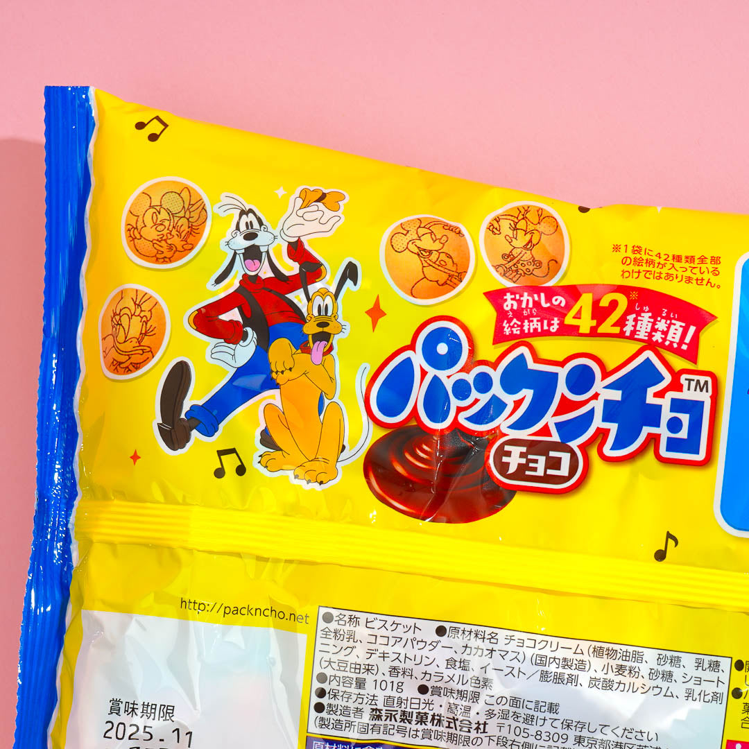This large pack of chocolate cream-filled biscuits is perfect for parties. It features prints of popular Disney characters like Mickey Mouse, Donald Duck, and more. Take as many as you'd like when you head outside of your home!
