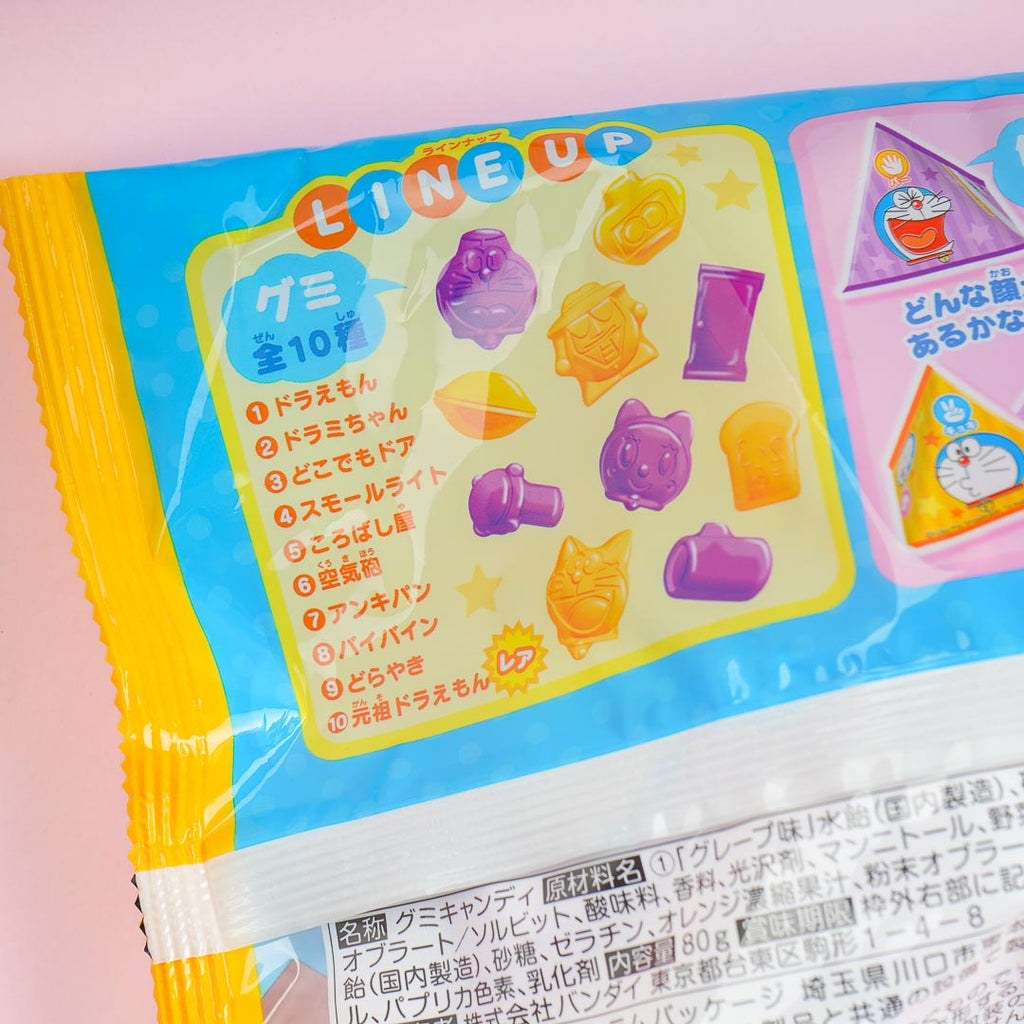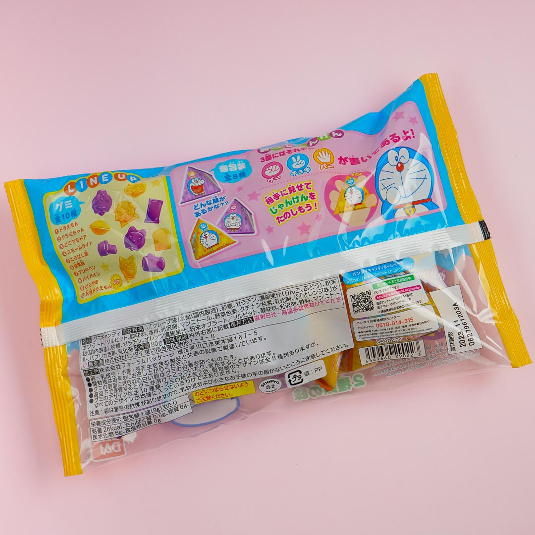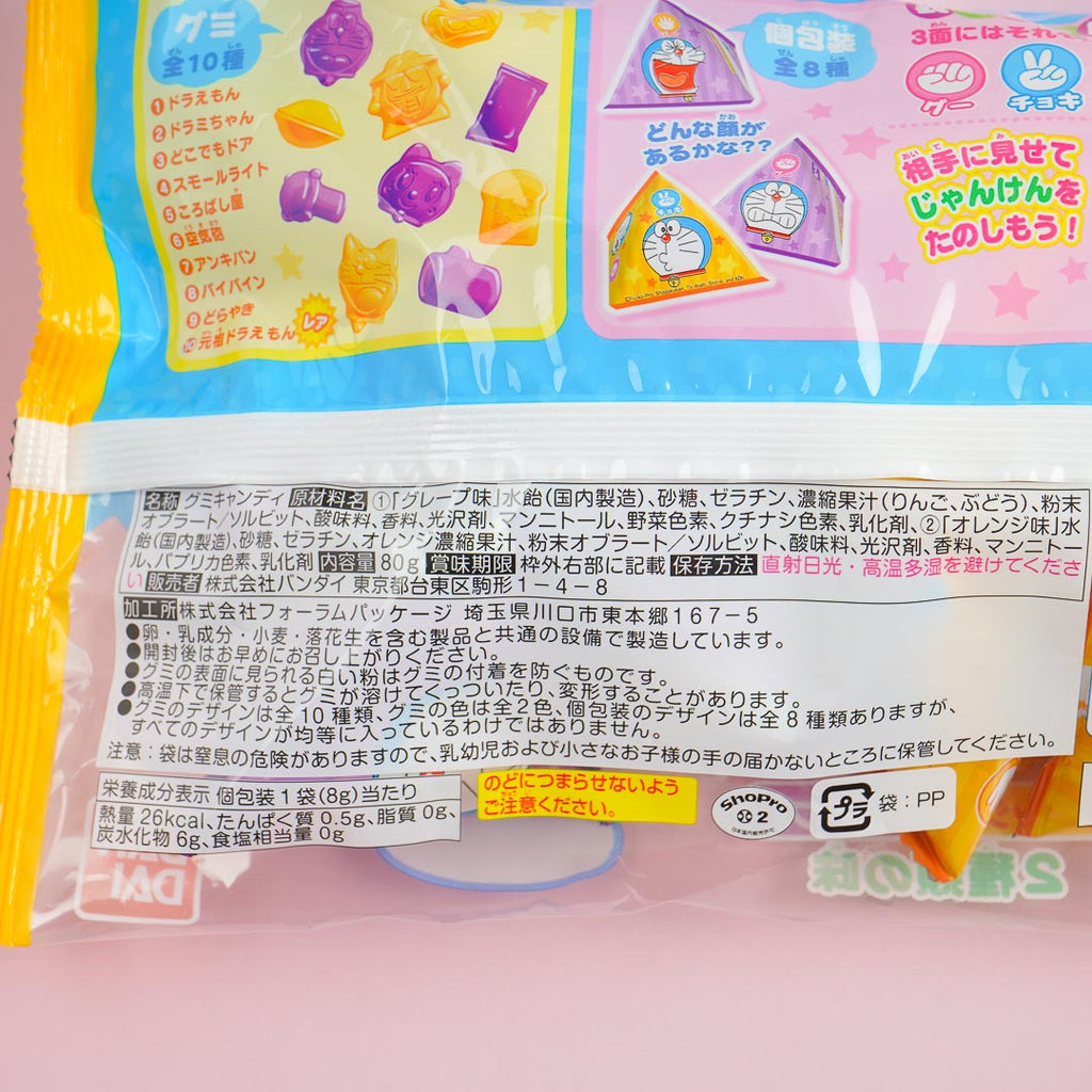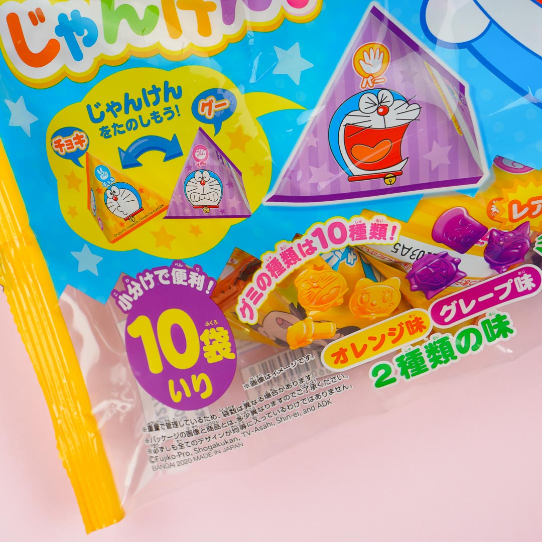 Chew on these yummy gummies while playing a game of rock-paper-scissors with your friends! This pack contains 10 types of character-shaped gummies. Each piece is flavored with refreshing grape or orange juice and comes in individually wrapped packaging that features prints of Doraemon with a hand sign.