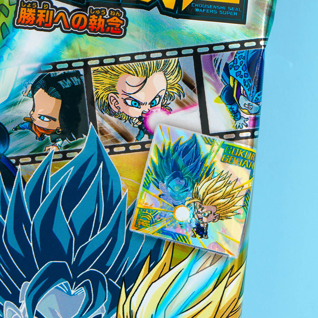 Nibble on this cococoa cream wafer pack while watching your favorite anime! It features prints of Dragon Ball characters from the Super Warrior arc. Inside you'll also find a collectible Dragon Ball sticker. Surprise yourself with a random sticker selected from a set of 31 different designs!