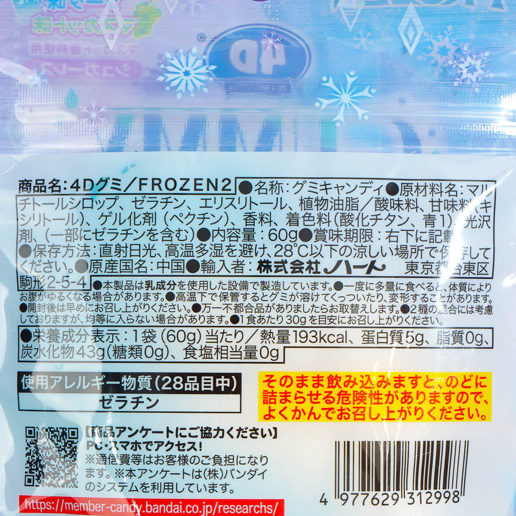 Have fun munching on these refreshing gummy candies featuring the Disney movie Frozen! There are two kinds of gummies in this pack: an Olaf-shaped gummy with muscat flavor and a snowflake-shaped gummy that tastes like soda. They come in a resealable pouch so you can keep them fresh!