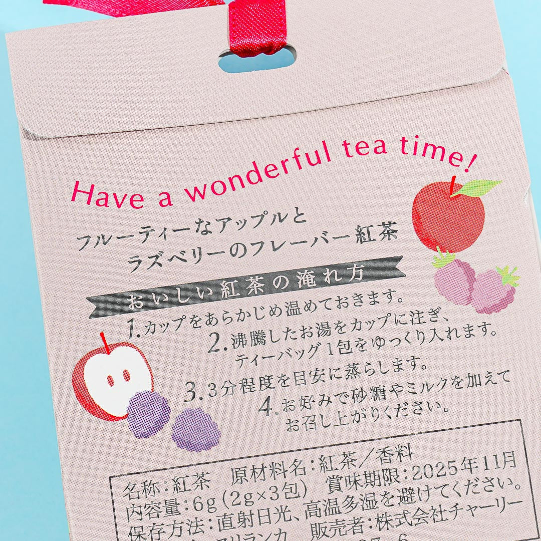Enjoy a warm cup of tea with your besties with this special box! It contains tetra-shaped bags of black tea infused with sweet apples and tangy raspberries. These come in a fancy gift box decorated with prints of fruits and a cat!