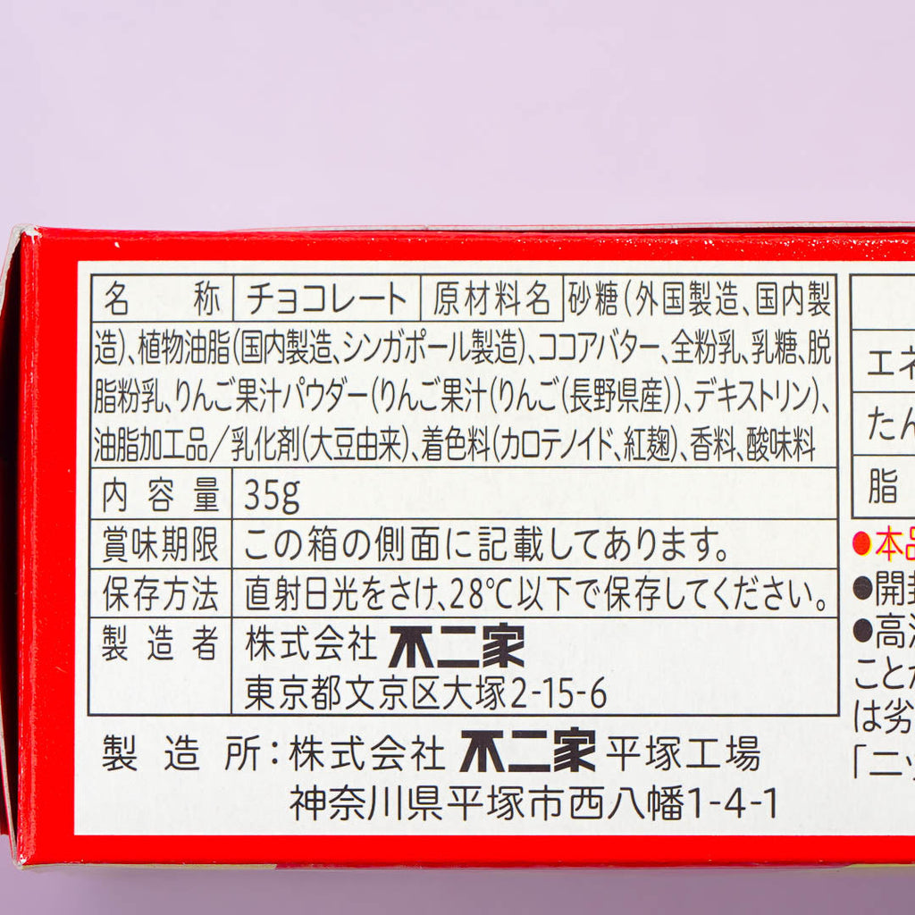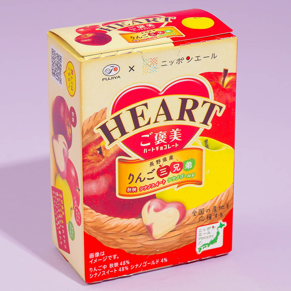 Reward yourself with a delicious treat after a busy day! These heart-shaped chocolates have a unique white and red marble pattern. The box contains three special Japanese apple flavors — Akiei, Shinano Sweet, and Shinano Gold.