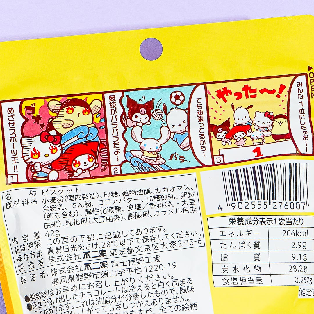 Enjoy this pack of crunchy biscuits while looking at cute and sporty Sanrio Characters! Each milk-flavored biscuit is printed with a Sanrio Character and has a milk chocolate coating at the bottom.