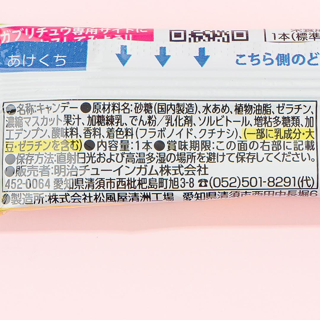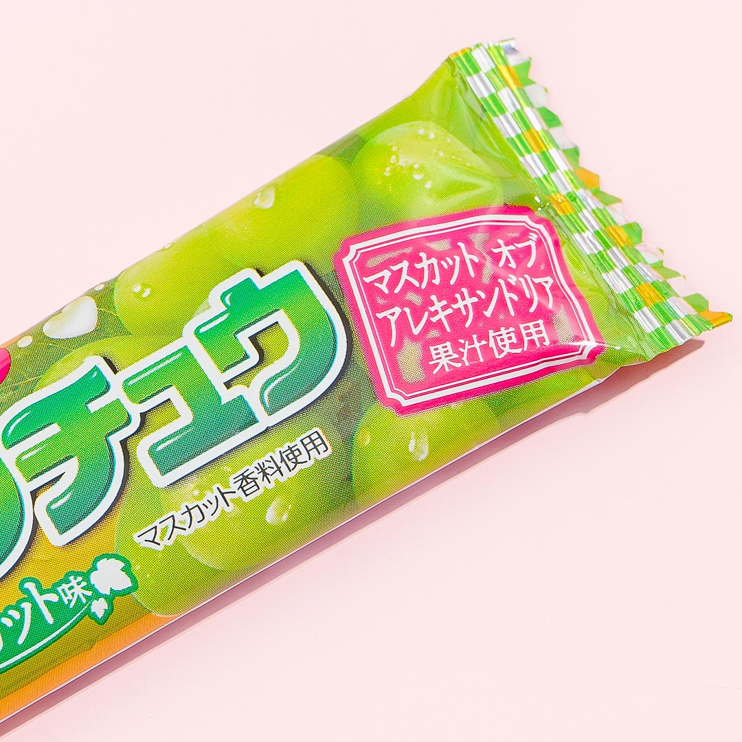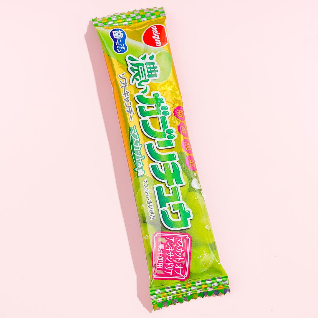 This dark premium bar of soft chewy candy is made with actual fruit juice. Enjoy the taste of the muscat grapes of Alexandria with every chewy bite you take! It's the perfect candy to indulge in.