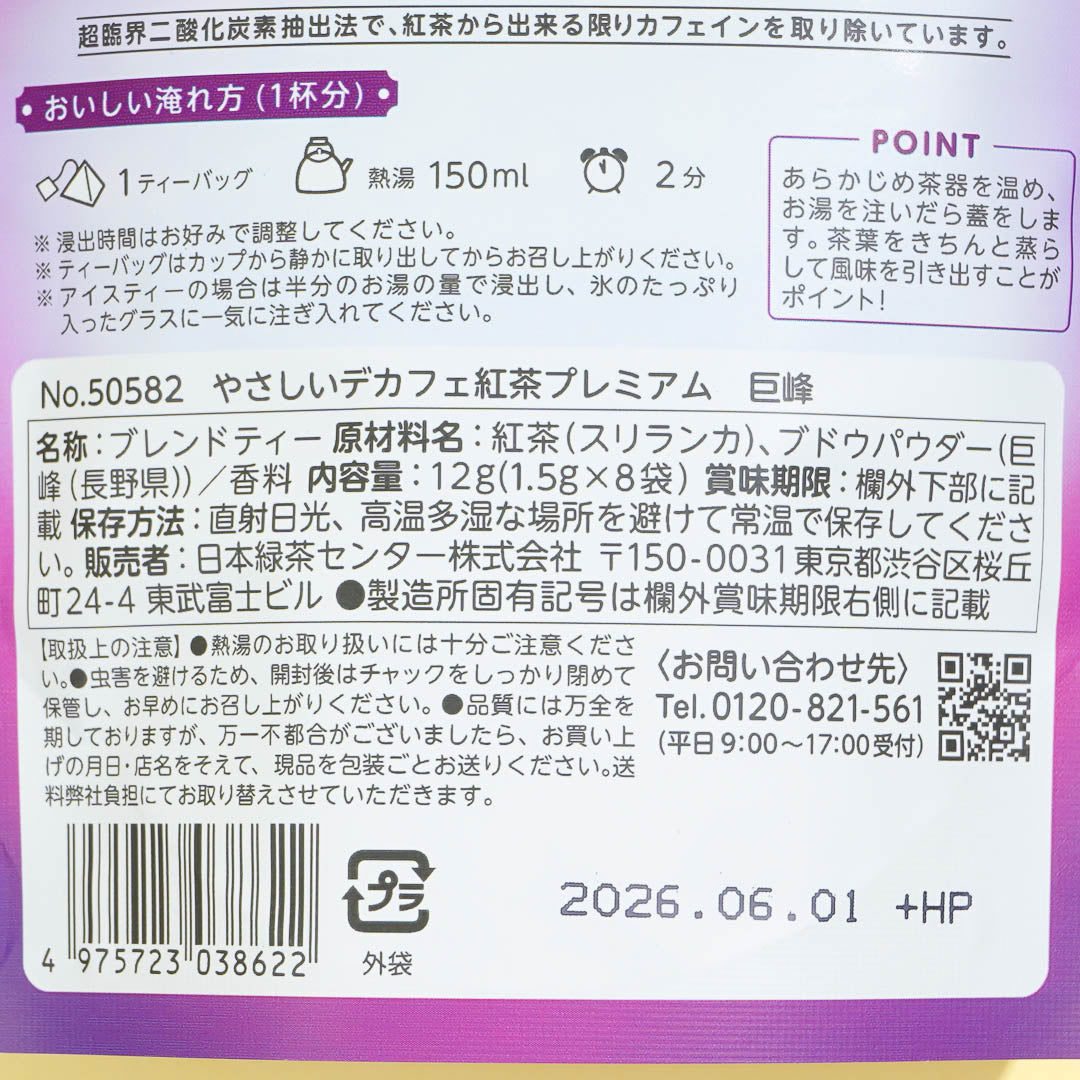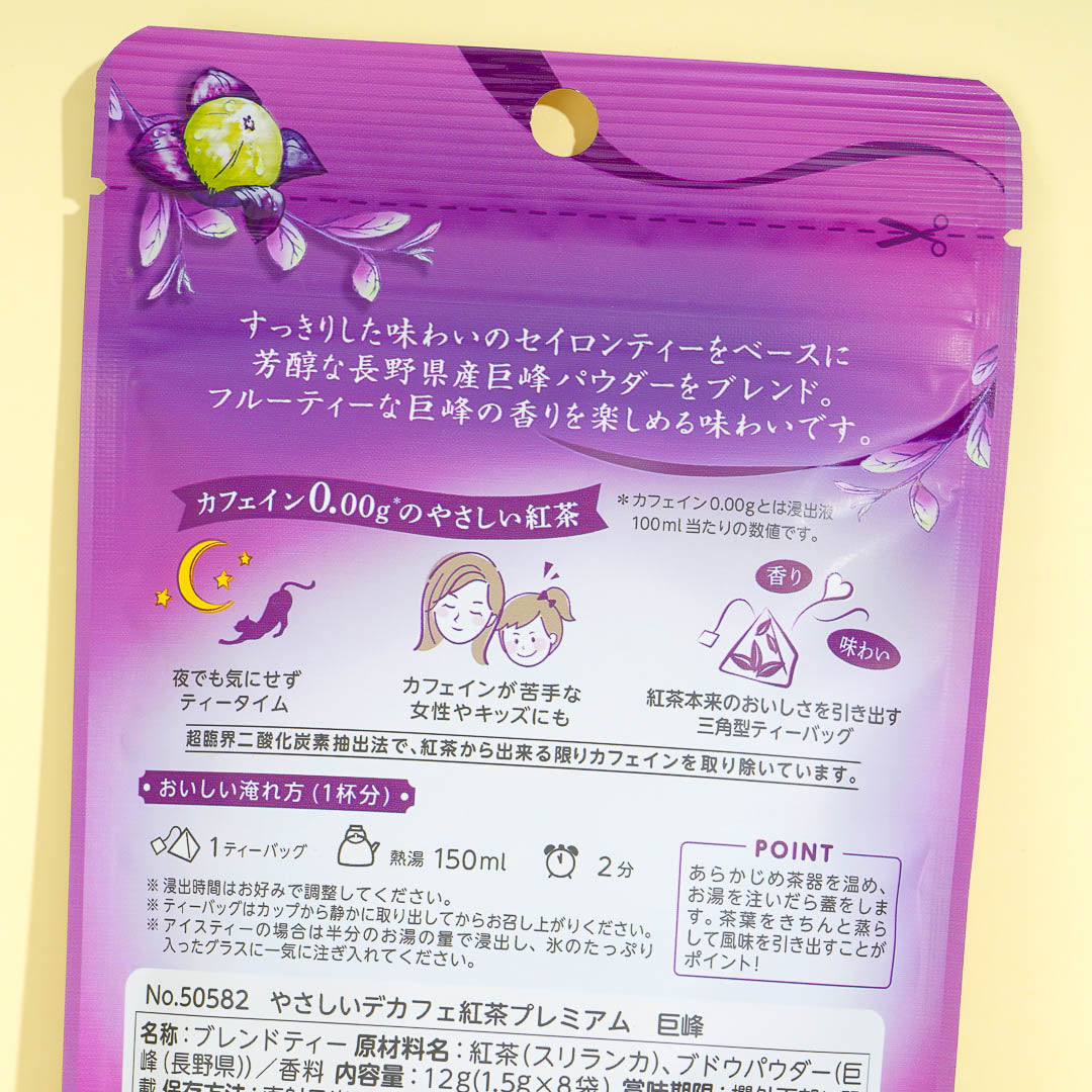 This pack of tea bags makes for delicious decaf tea! It combines together the refreshing taste of Ceylon tea and mellow Kyoho grapes from the Nagano prefecture in Japan. This tea has no caffeine so you can drink as much as you'd like.