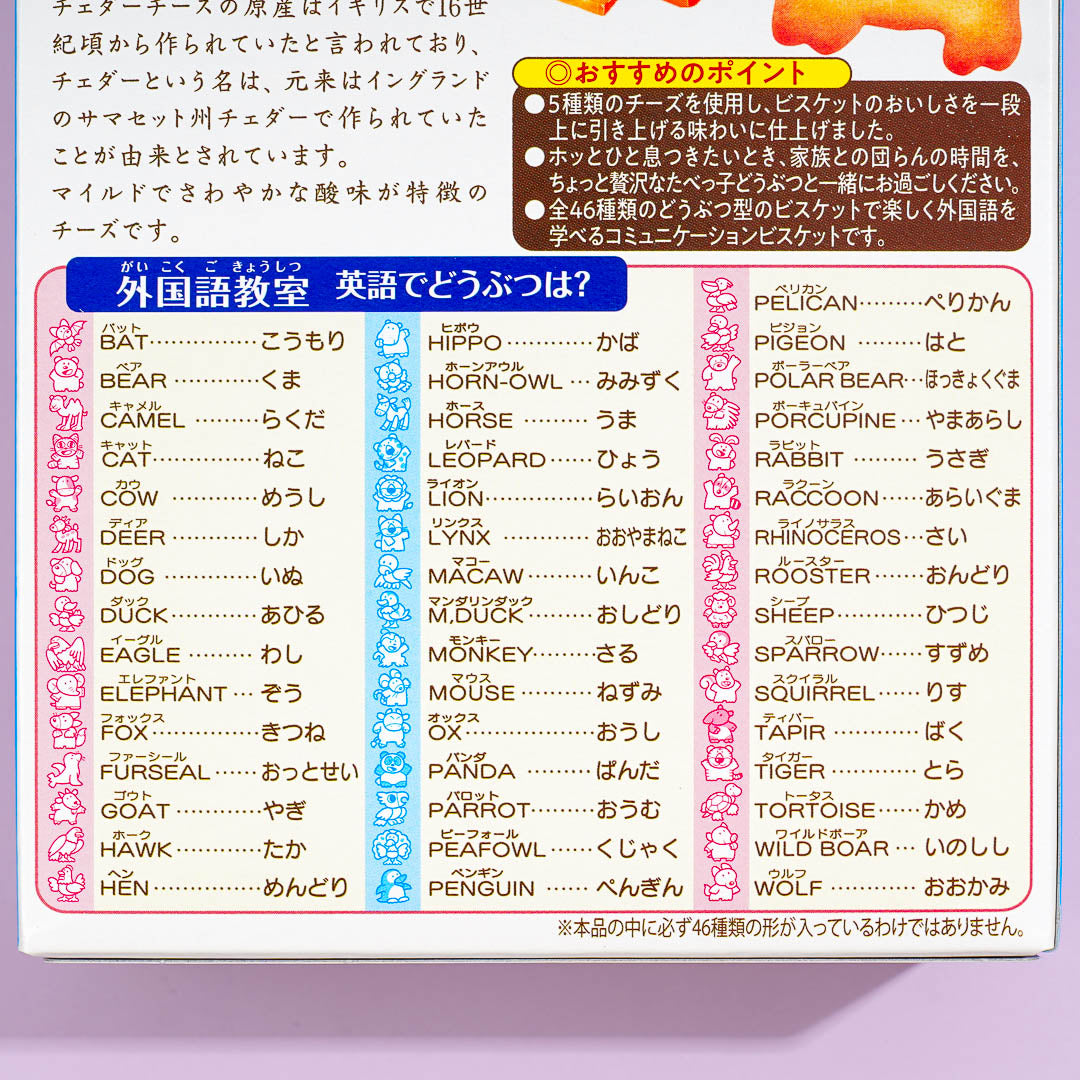 This new series from Ginbis Tabekko Animal Biscuits is made with five types of high-quality cheese. Each piece is shaped like an animal and has the English name printed on the biscuit. Have this snack for a quick hunger fix!