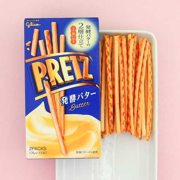 Pretz is a delicious, funny biscuit snack from Japan, made by the famous Glico! Not only do Pretz sticks come in any flavor you can imagine, but they also come in a broad array of styles and shapes. These salty sticks are butter flavored! The package has 2 smaller packages inside, so they are super easy to take with you where ever you go! Yummy!