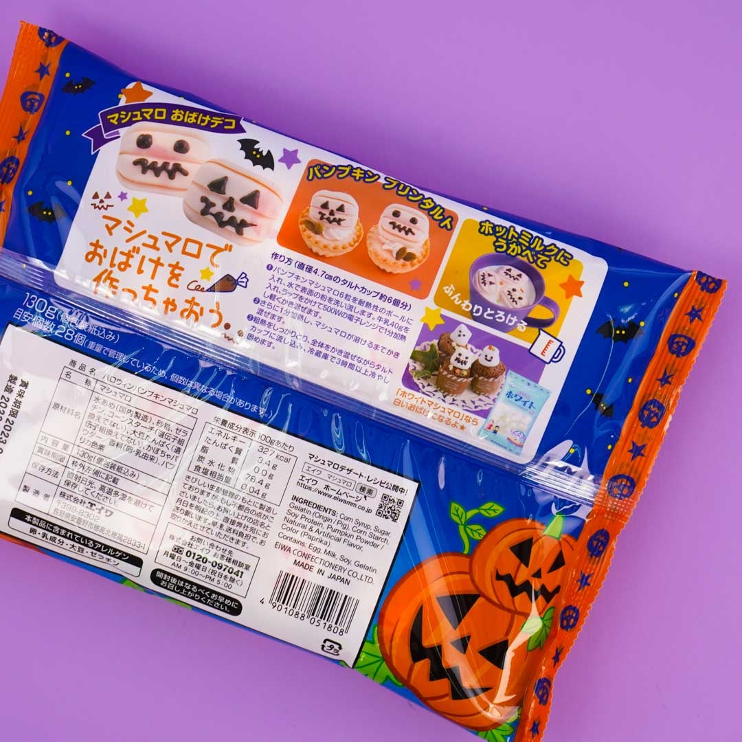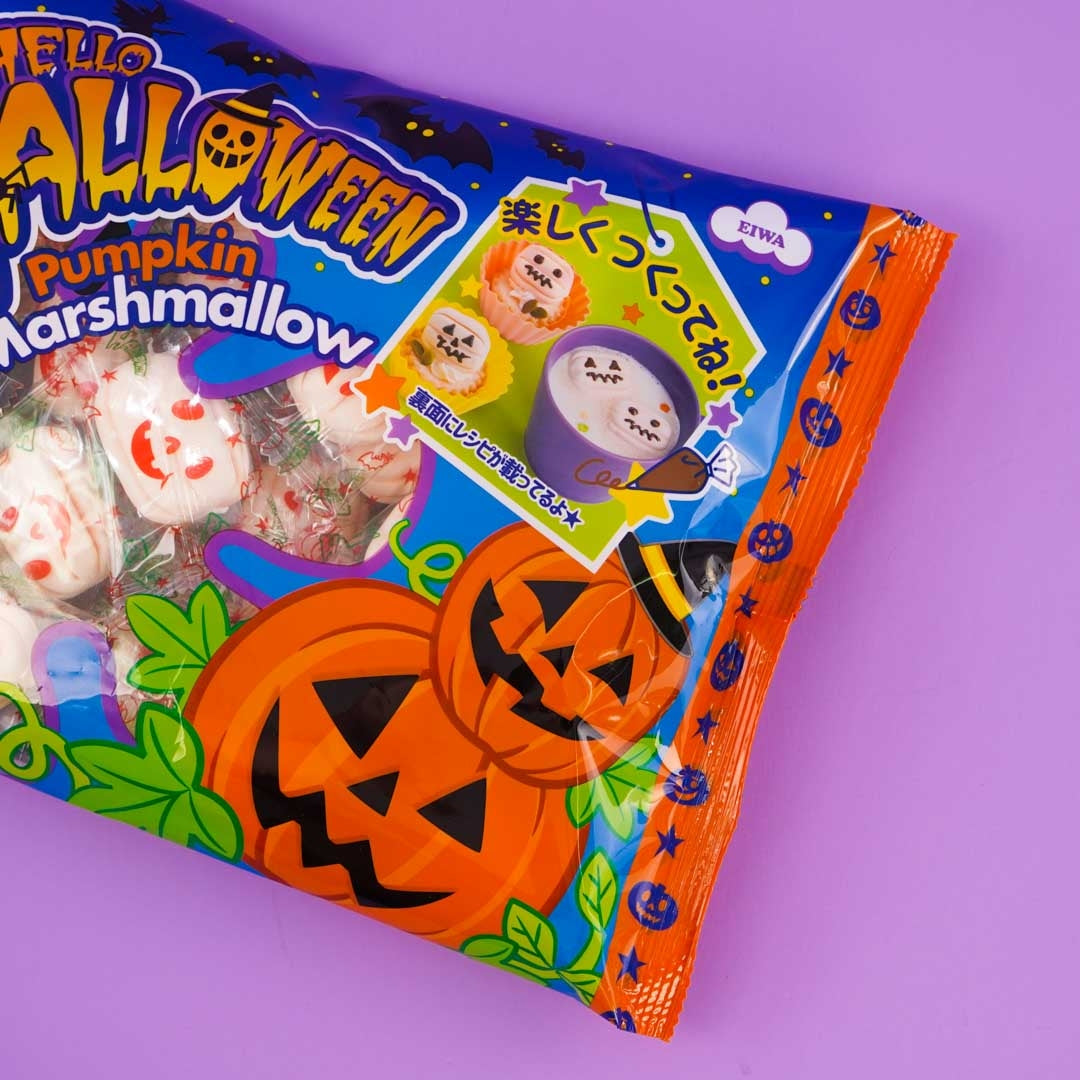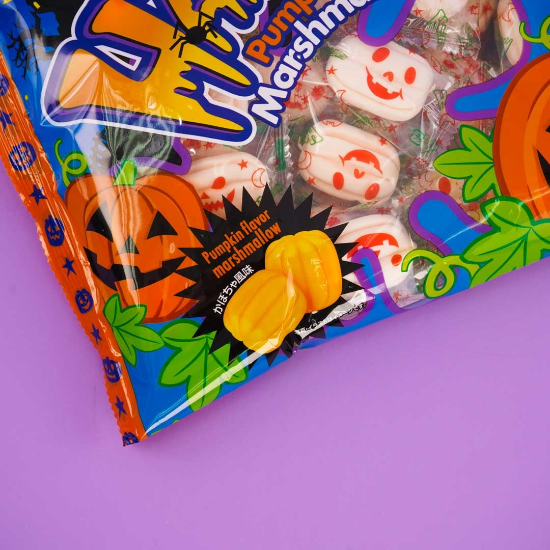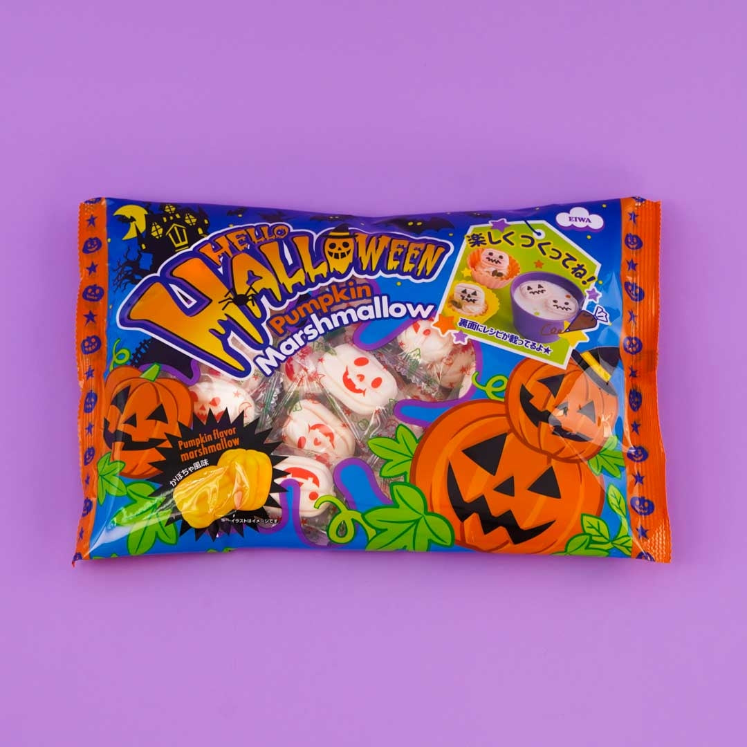 A big pack of individually wrapped pumpkin-flavored marshmallows that look like Jack-’o-Lanterns